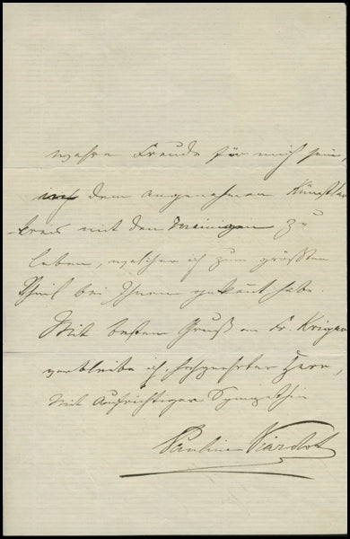 "Honored Sir, I will lend my name on the title page of your 'vergängliche lieder' [passing songs] with the greatest pleasure and maybe I can sing them for you while I still have a voice for them. We firmly intend to stay in Berlin for 2 whole months next winter - all of us together. The children are anticipating it with pleasure and their Mother even more so. It will be a real joy for me to live with my family in the pleasant circle of artists, most of whom I have known through you. With best regards to Mrs Kriger I remain, very honored Sir, with sincere feelings - Pauline Viardot."