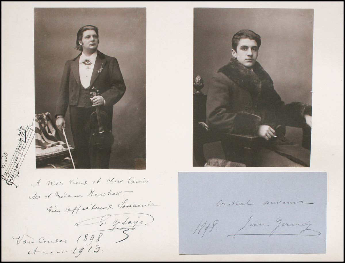 Ysaye, Eugene. (1858–1931) & Gérardy, Jean. (1877–1929) & Abott, Bessie. (1878–1919). Autograph Musical Quotation and Original Photographs. Rare AMQS from the masterful violinist on a large page together with a signed mounted card and early original photograph of the great Belgian cellist, Jean Gérardy.