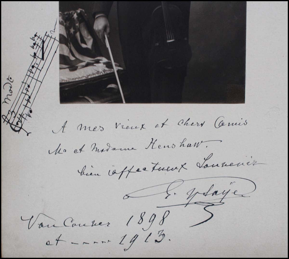 2 boldly penned measures of music identified as "mod[era]to" in Ysaye's hand, signed and inscribed "A mes vieux et chers Amis Mr. et Madame Henshaw / bien affecteux Souvenir E. Ysaye / Vancouver 1898 et ... 1913" on a large album page below an original mounted photograph. The mounted photograph and signed page from Gérardy are to the right and the verso of the page includes an autograph inscription and striking large mounted original albumen photograph of American opera singer Bessie Abott (1878 - 1919). From an album compiled by Julia Wilmotte Henshaw (1869 - 1937), English-Canadian botanist and journalist. 25 x 33 cm.