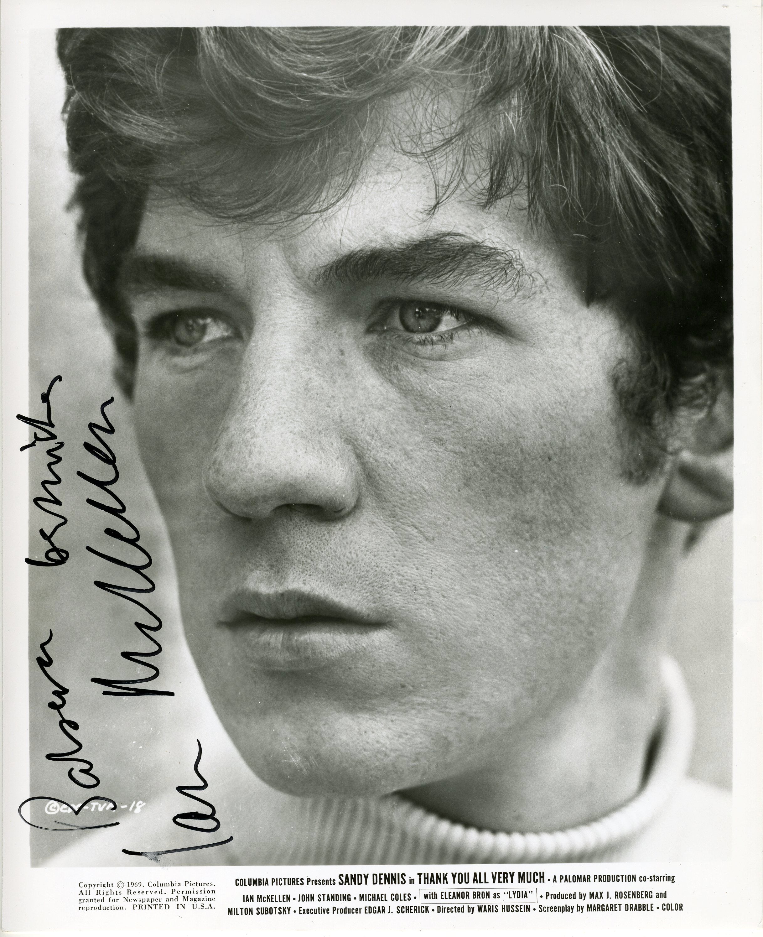 An early photograph of the legendary British actor and activist in one of his first film roles, as George in the 1969 film "Thank You All Very Much," boldly signed and inscribed in black marker at the left. A later glossy reprint with original signature in very fine condition, 8 x 10 inches (20.7 x 25.3 cm).