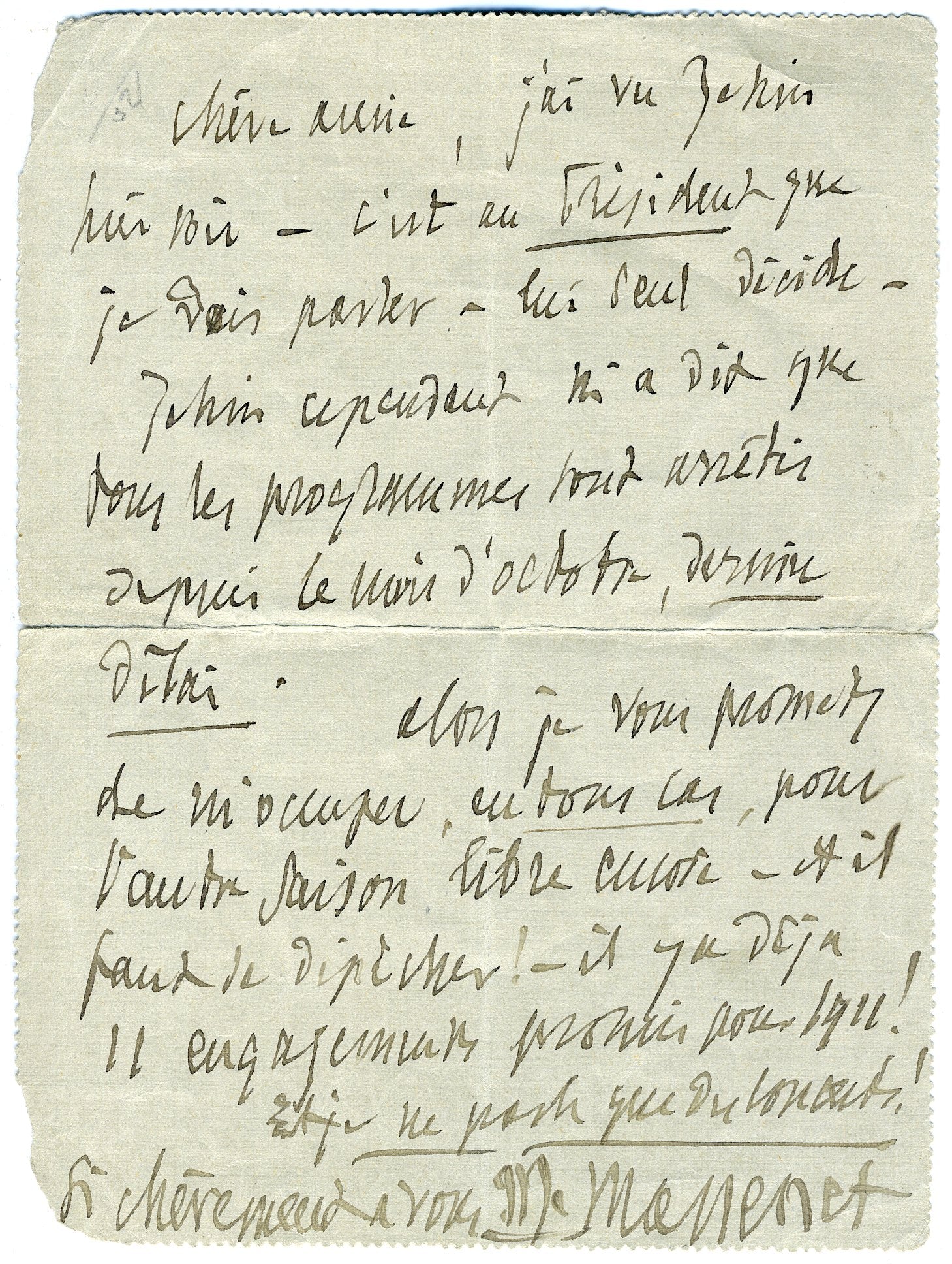 Autograph letter signed from the important French opera composer, promising a female friend that he will do his best to schedule a performance in the coming season. Translated from the French: "[...] So I promise I will take care of it, in any event, for the other, still free, season - and we must hurry up! - there are already 11 engagements scheduled for 1911! - And I only take concerts!"