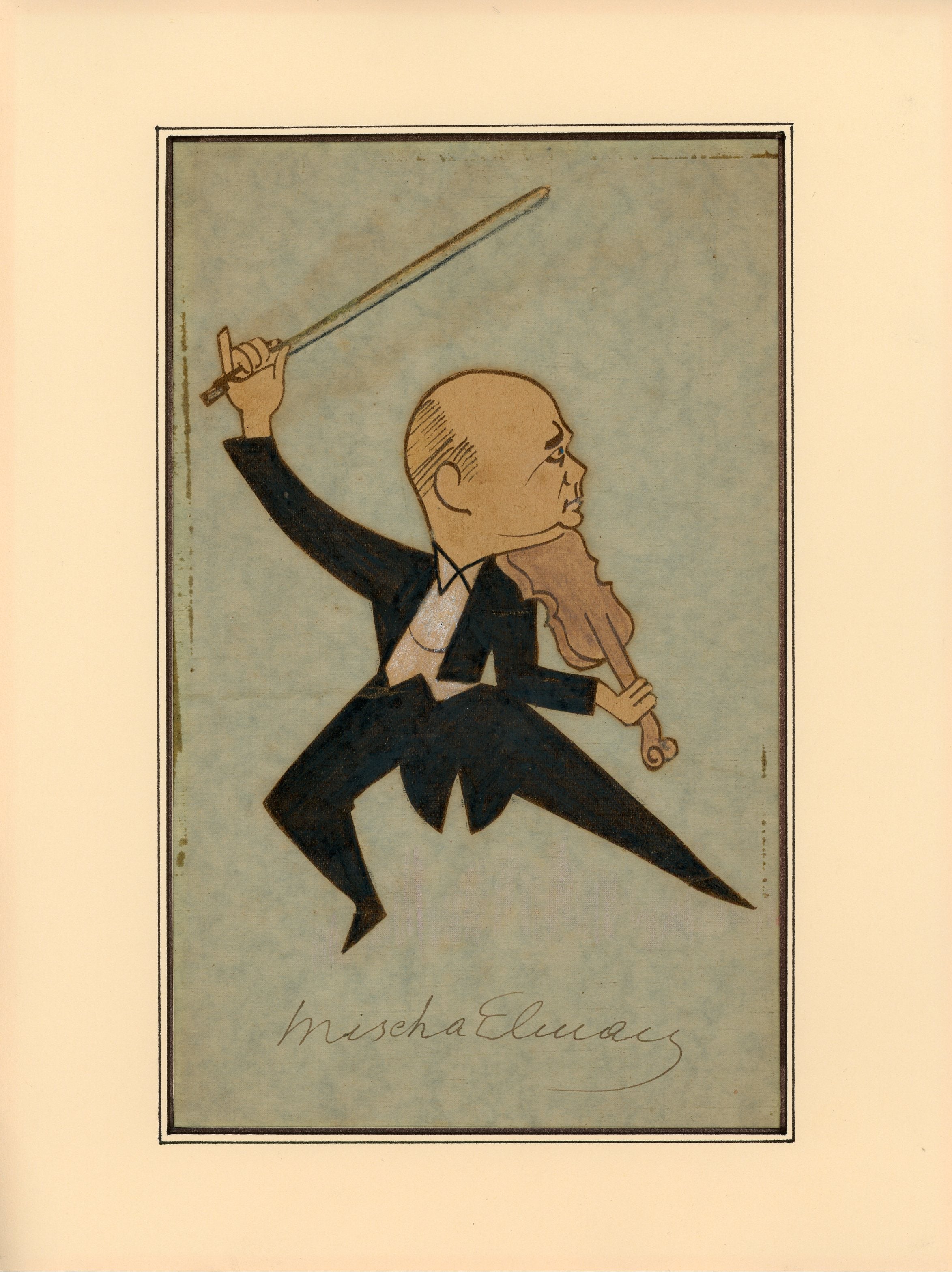 A charming ink caricature portrait of the great violinist known for his sensuous and infinitely expressive tone, boldly signed by the violinist at the foot. The whimsical portrait is a collage of paper mounted on light blue canvas, and depicts Elman in tails, looking ready to start fencing with his violin bow. Some light spotting around the edges; overall in fine condition. 5 x 8.25 inches (13 x 21 cm), matted to 8 x 10.5 inches (20 x 26.6 cm). Unique!