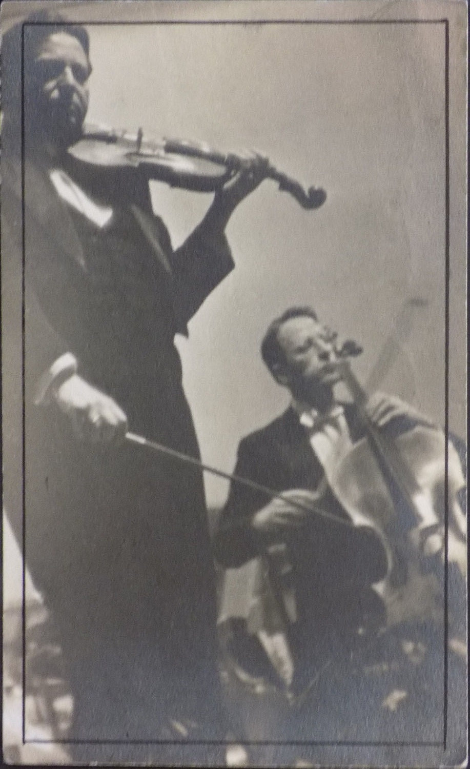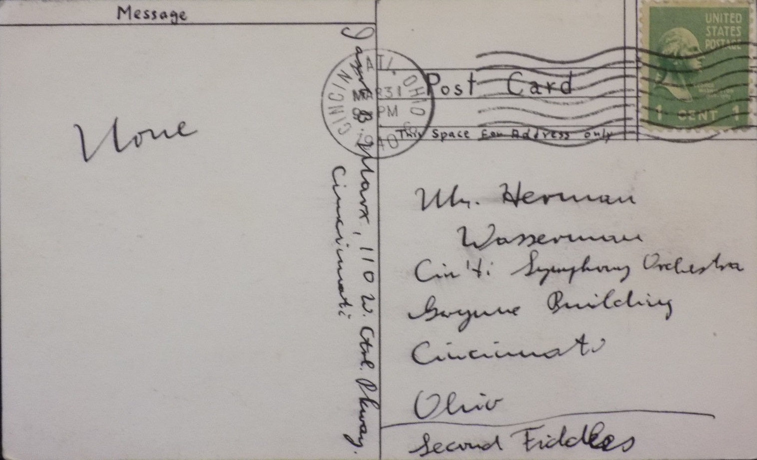 Original postcard photograph by Jacob B. Marx of the eminent Romanian-born violinist and composer together with an unidentified cellist, addressed on the verso to violinist Herman Wasserman at the Cincinnati Symphony ("Second Fiddles") and postmarked March 31, 1940. This is not a published image, and has evidently been prepared by the photographer himself who has neatly drawn a border on the image side, as well as the section markers and note on the verso. Most unusual.