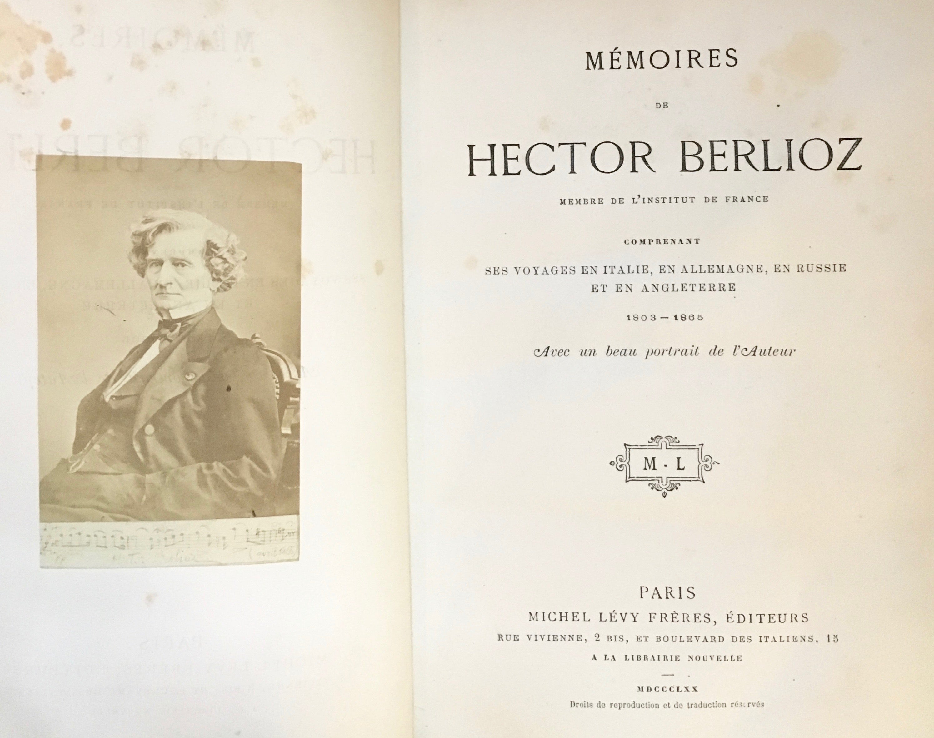 Berlioz had 1,200 copies of the Mémoires printed in 1865 and kept in his office at the Conservatoire. He gave several copies away during his lifetime; the remainder (the present copy being one), however, were not released for publication until 1870. The original frontispiece photograph of Berlioz includes a facsimile of a musical quotation from the Symphonie Fantastique.
