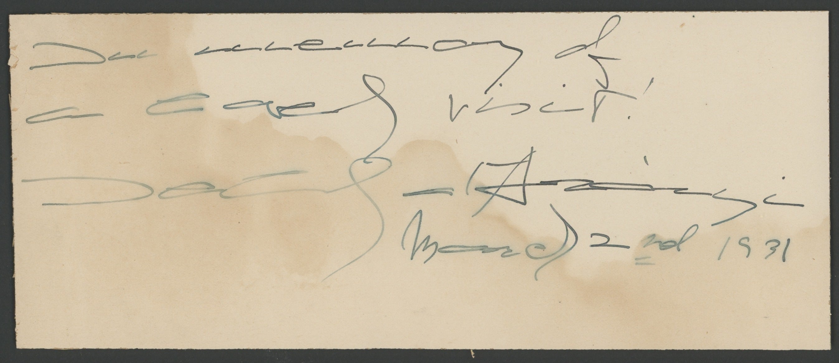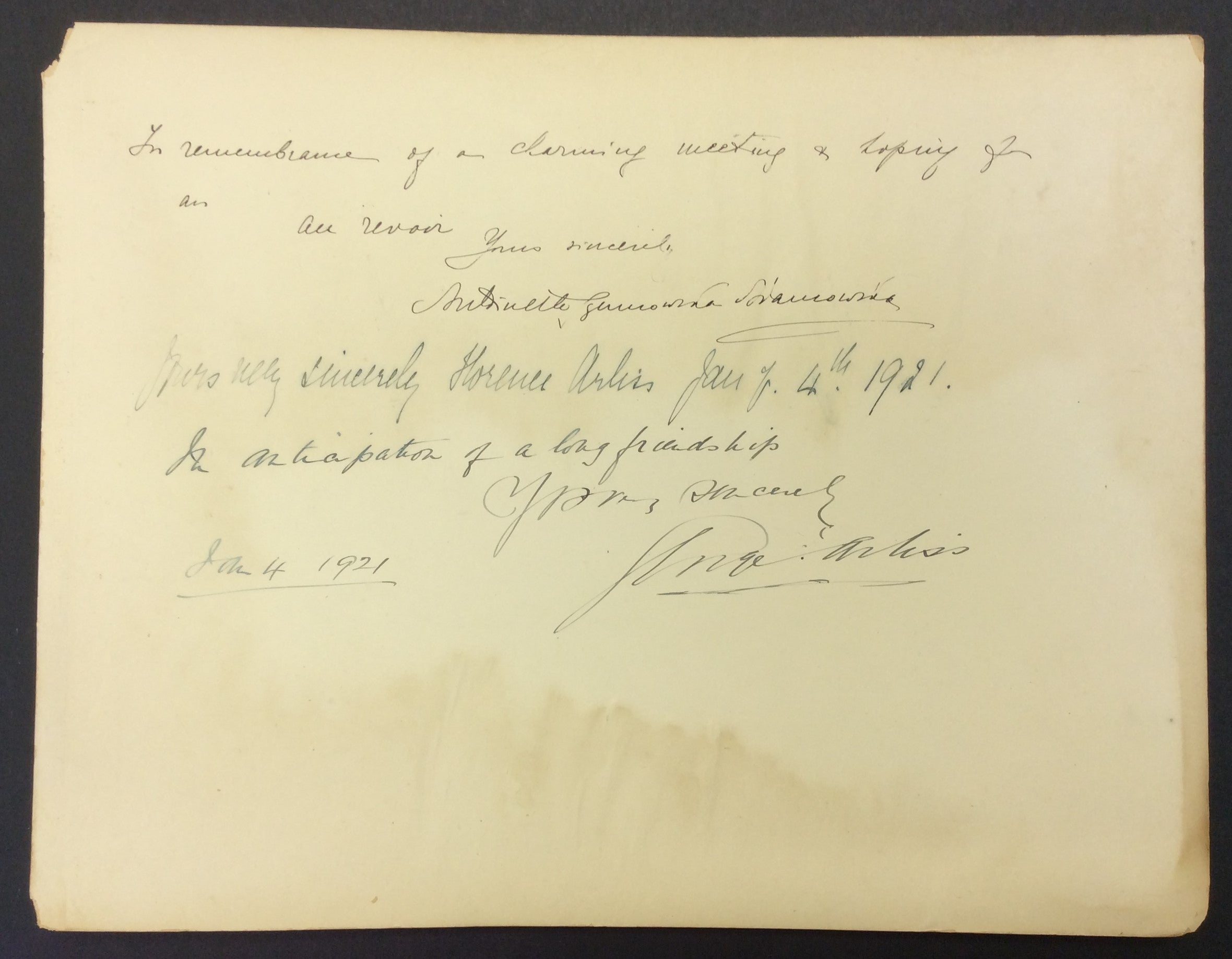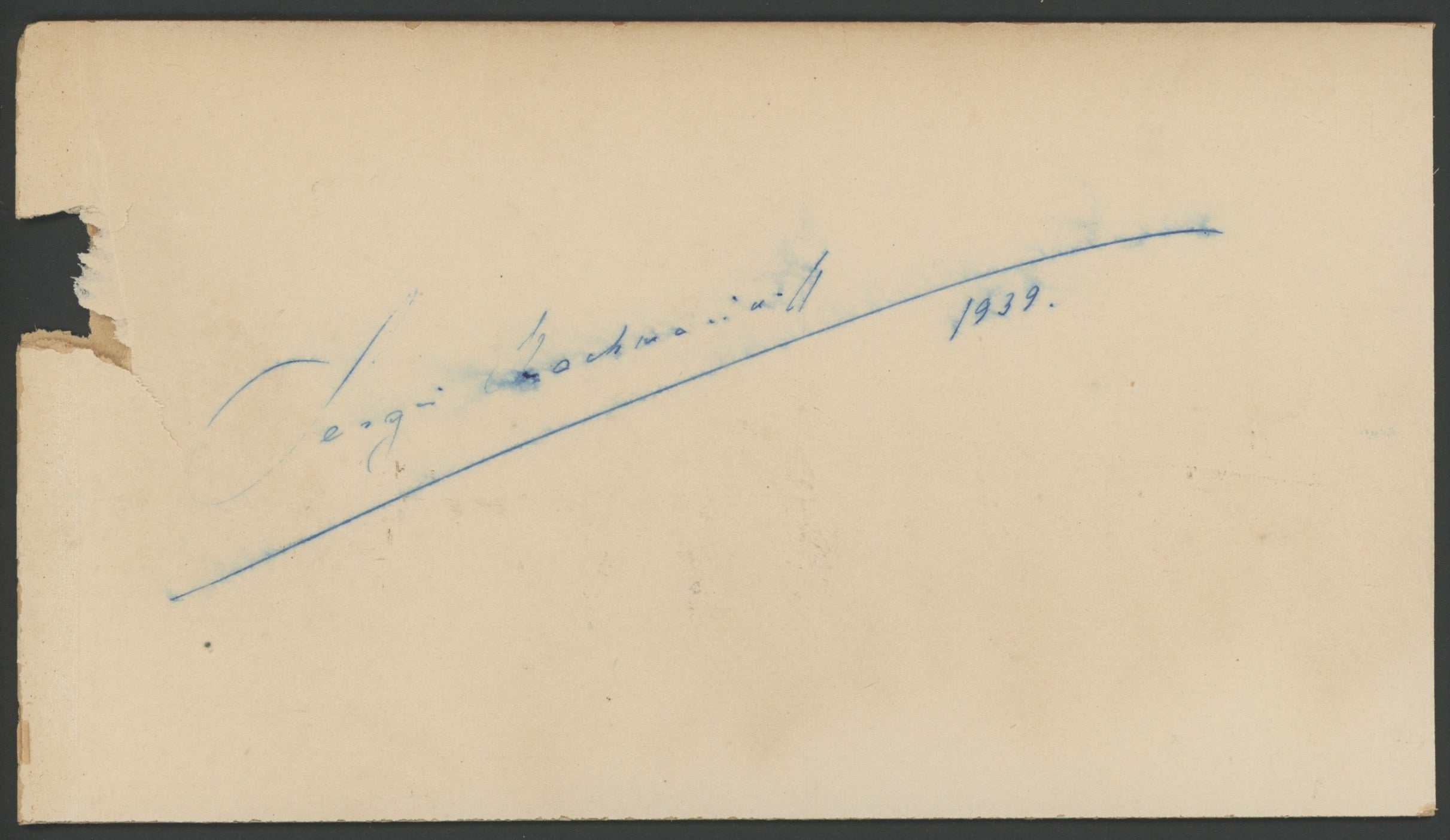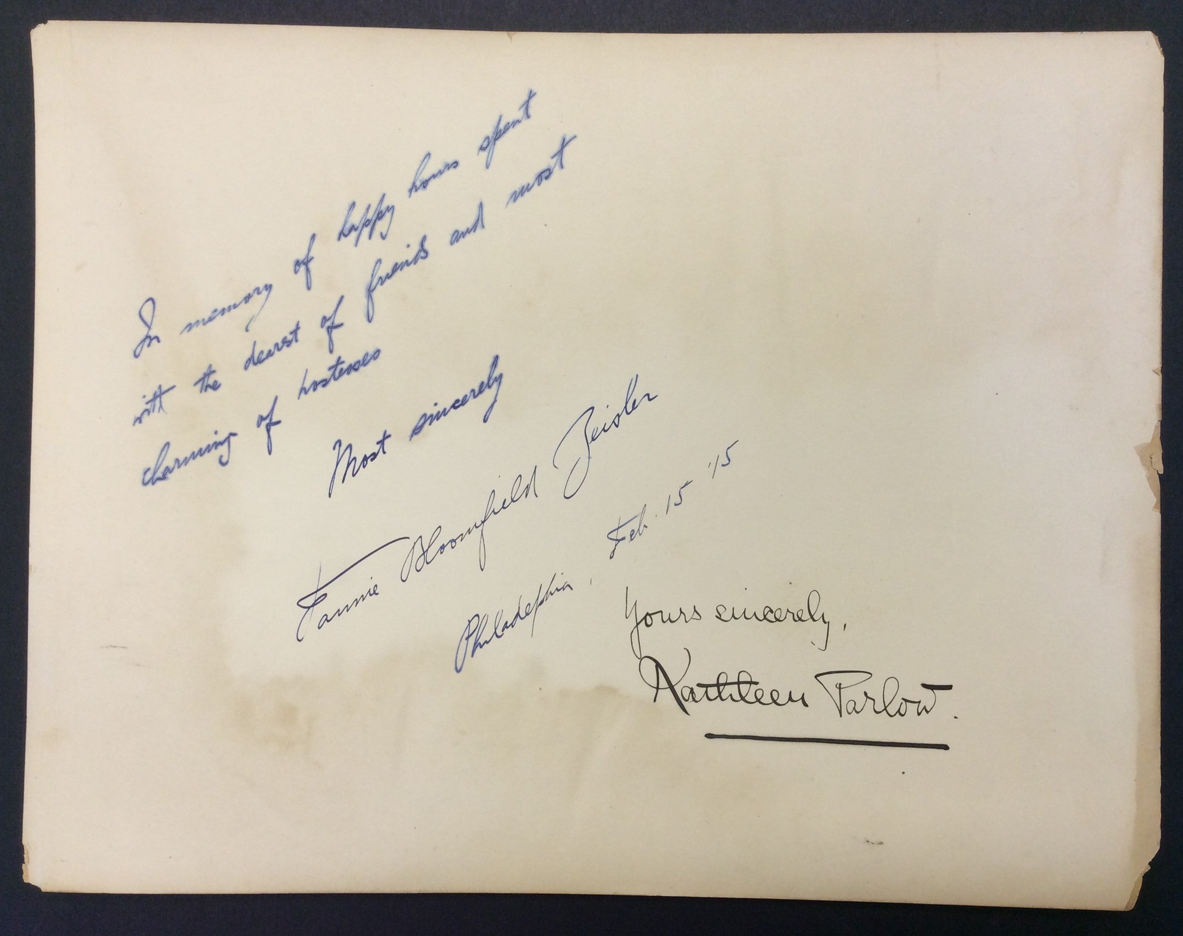 An interesting group of autograph signatures collected in the early twentieth century, from singers, instrumentalists, and actors of the era. The signatures include: Sergei Rachmaninoff (dated 1939); violinist Jelly D'Aranyi (dated March 2, 1931); American film actress Edith Barrett; Metropolitan Opera singers Lucrezia Bori, Maria Duchêne, and Marie Mattfeld (together on one page and dated December 1914), Melanie Kurt, and Matja von Niessen-Stone (dated June 9, 1915); Austrian-born pianist Fannie Bloomfield Zeisler (dated February 15, 1915); violin prodigy Kathleen Parlow; Polish-American pianist Antoinette Szumowska; and actor-actress couple George and Florence Arliss (dated January 4, 1921). Signatures on heavy card leaves from an album, some trimmed down, with some light staining, toning, peeling, and small losses; overall in very good condition. Ranging in size from 8 x 4 inches (20 x 11.5 cm) to 13.25 x 10.25 inches (33.7 x 26 cm).