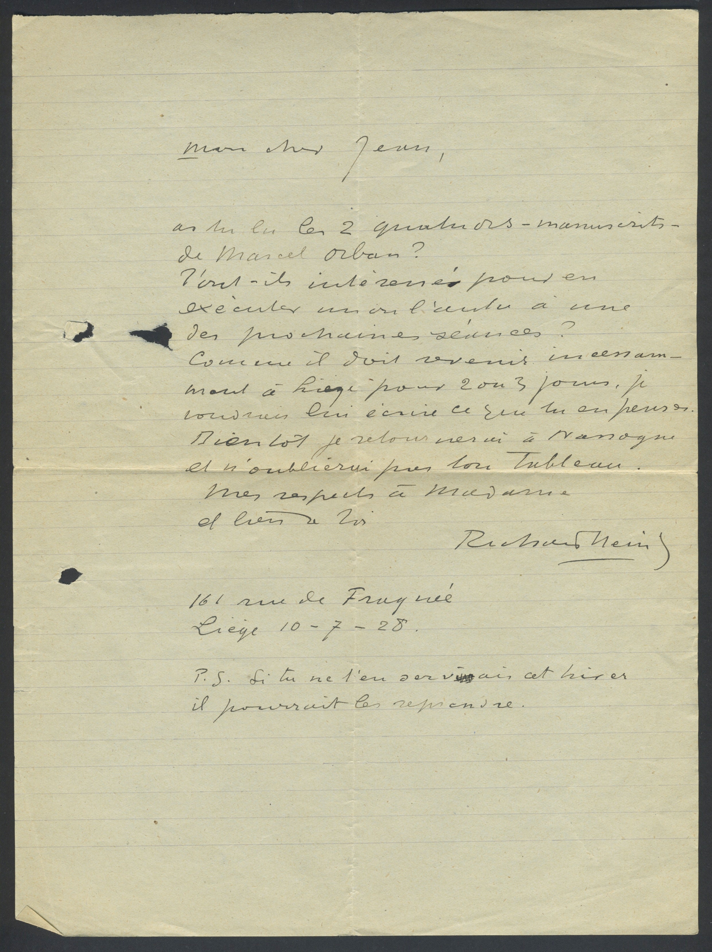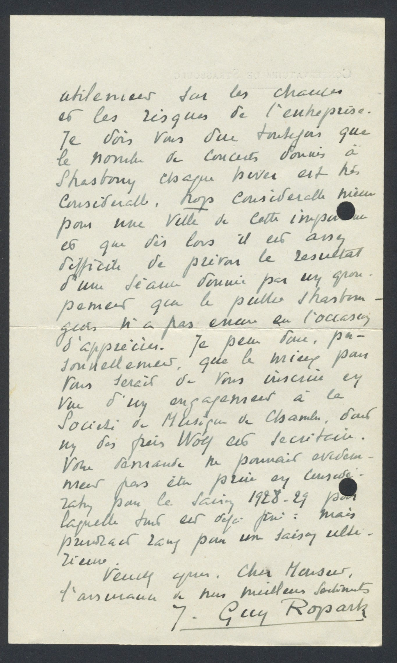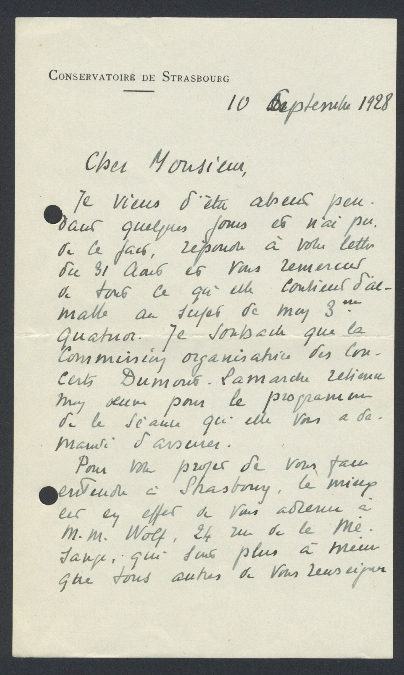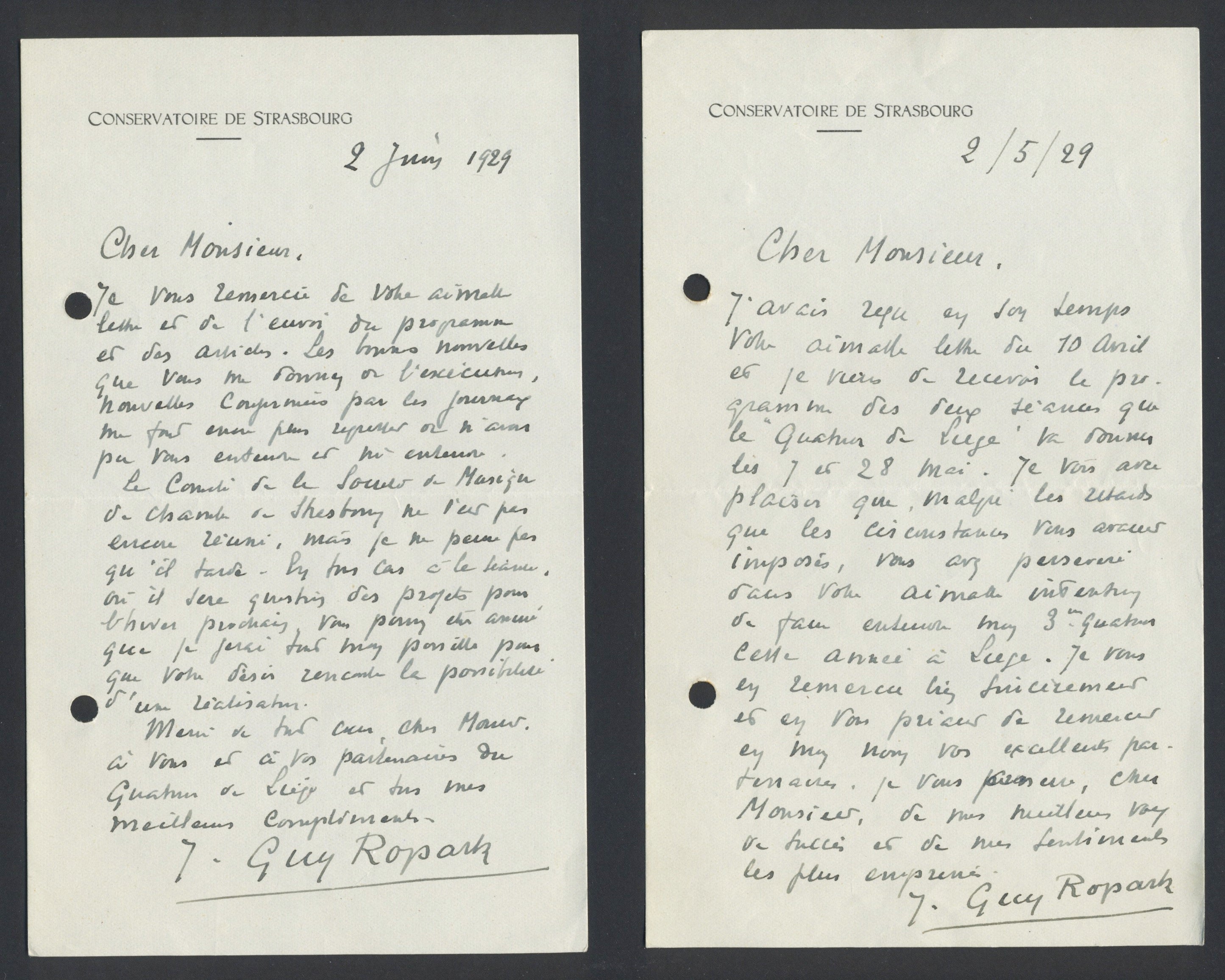 Three letters from French composer and conductor Guy Ropartz, May 2, 1929 (1 p.); June 2, 1929 (1 p.); September 10, 1928 (2 pp.) Ropartz thanks Rogister for programming his Quartet no. 3 in concerts of the Quatuor de Liège in May 1929; regrets that he was unable to hear the concert and mentions a meeting of the Societé de Musique de Chambre de Strasbourg; mentions arrangements for performing his quartet in Dumont-Lamarche and Strasbourg, and warns that "the number of concerts given in Strasbourg is very considerable, too considerable for a city of its importance..."