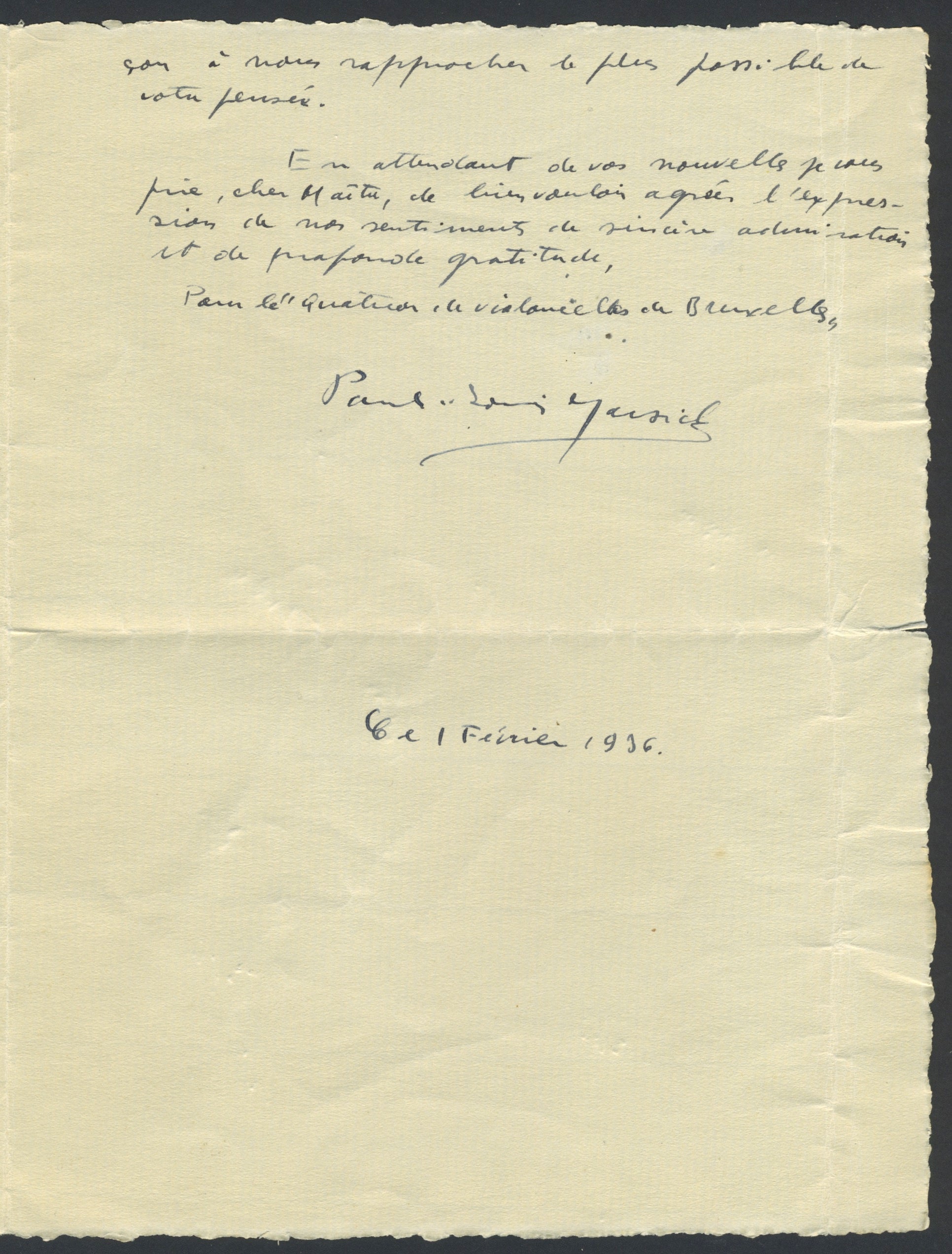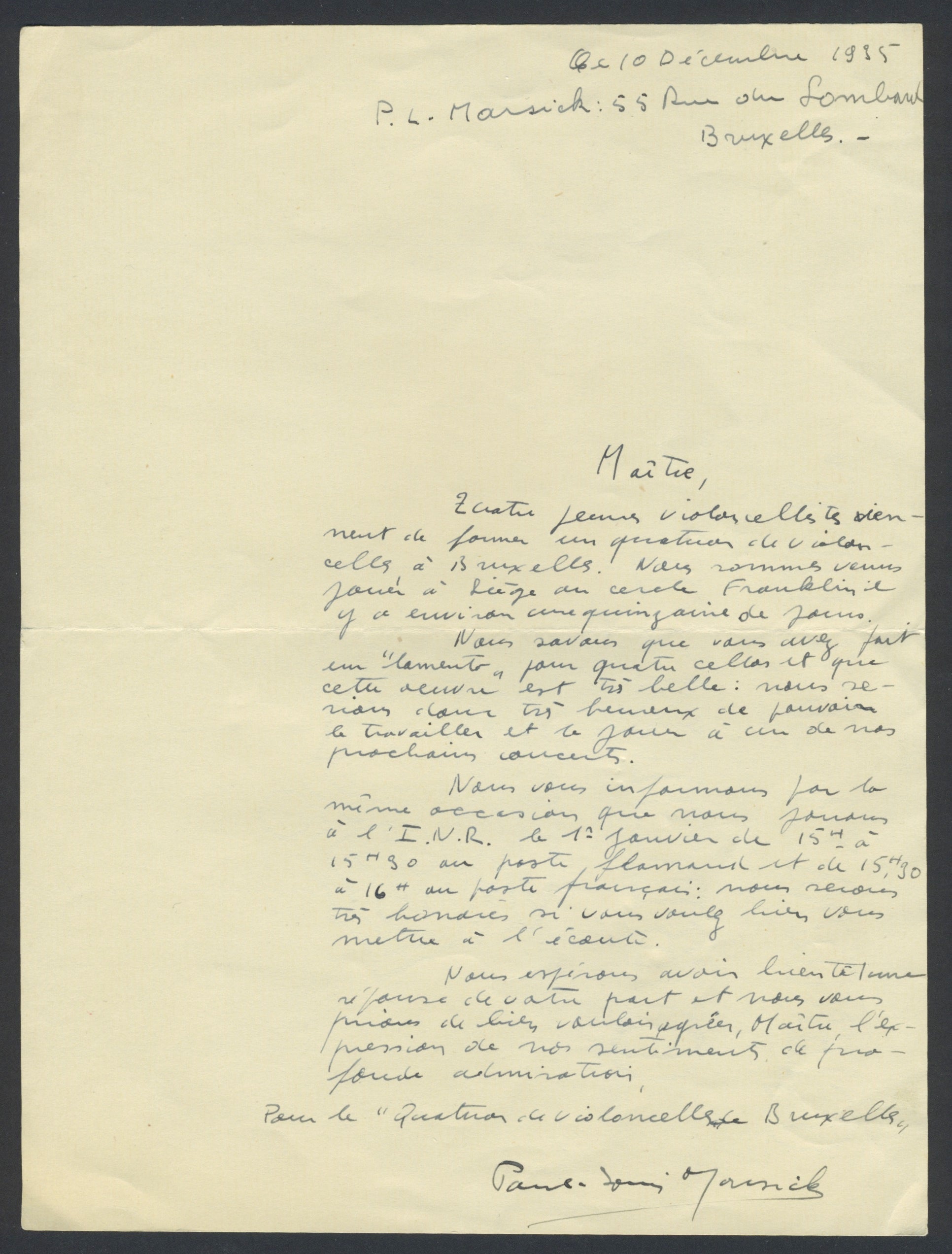 Two letters from Belgian cellist Paul-Louis Marsick, December 10, 1935 (1 p.); February 1, 1936 (2 pp.) Marsick reports on the founding of the Brussels Cello Quartet and asks if they may play Rogister's piece "Lamento"; asks if Rogister would be willing to write further movements to make a suite out of the work; and tells Rogister of upcoming concerts.