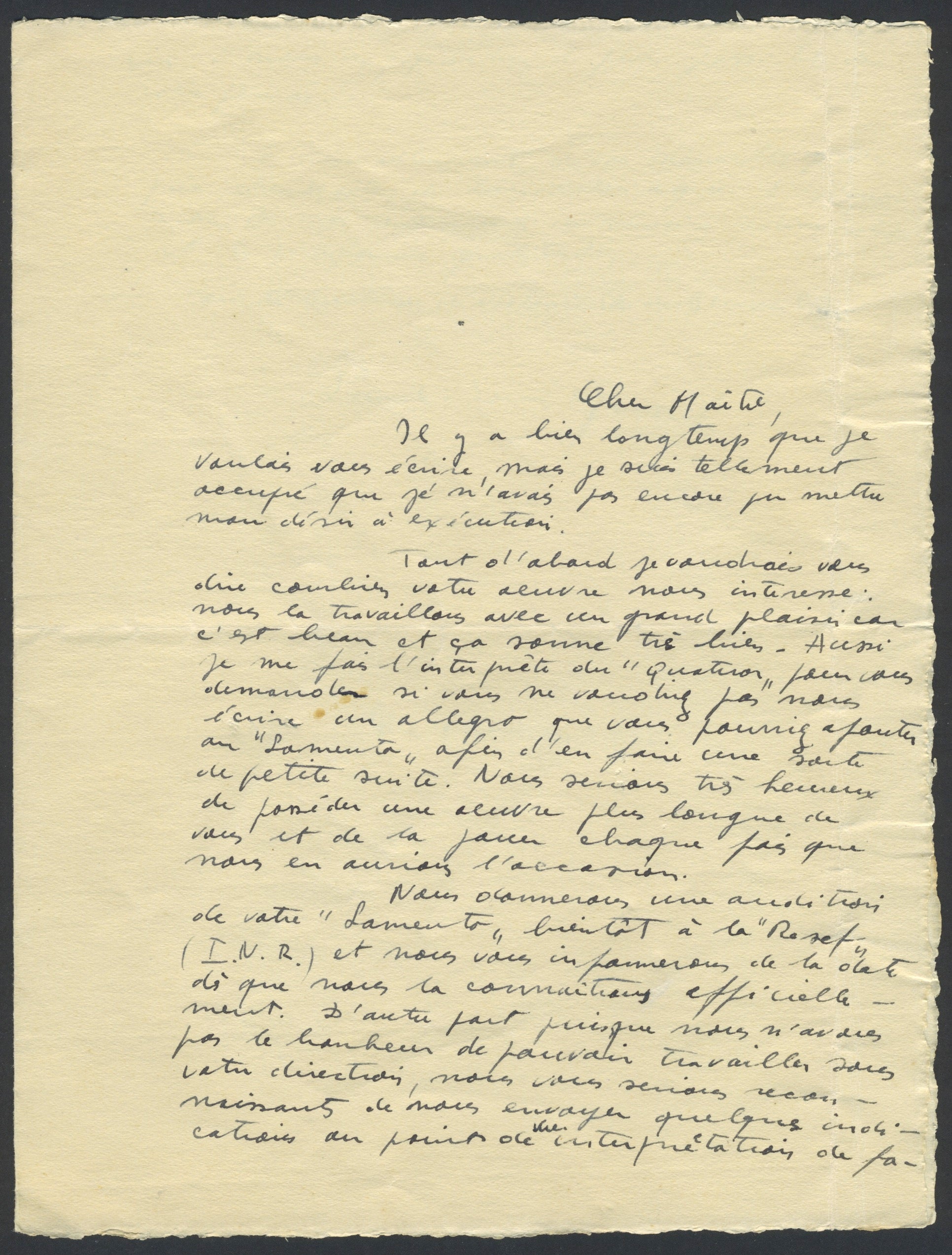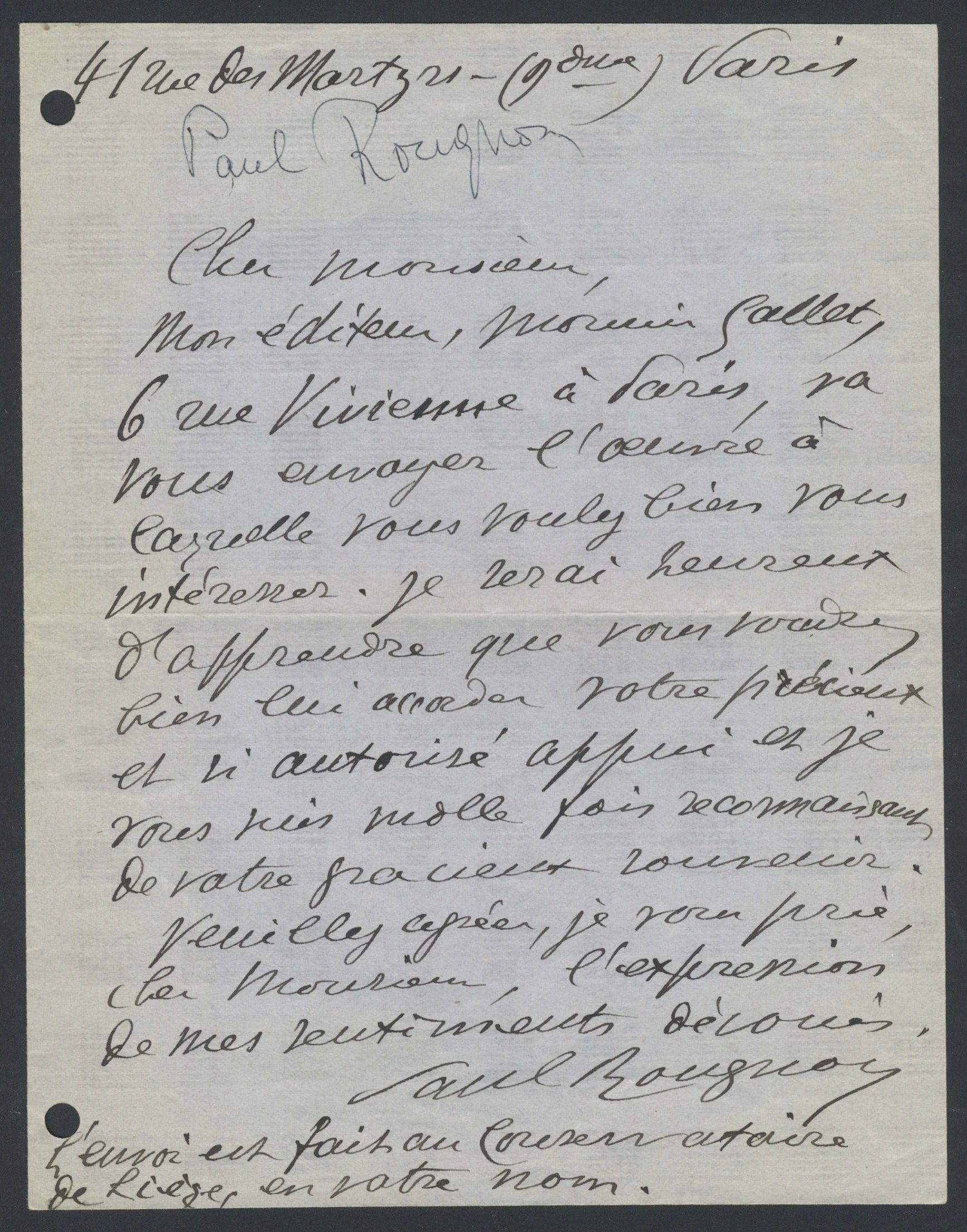 Autograph letter from French composer Paul Rougnon, regarding a piece Rougnon is sending for Rogister's interest. N.d., 1 p.