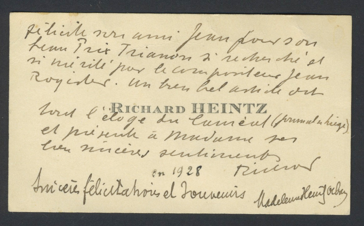 Autograph letter and autograph note on a visiting card from Belgian painter Richard Heintz. July 10, 1928 and 1928.