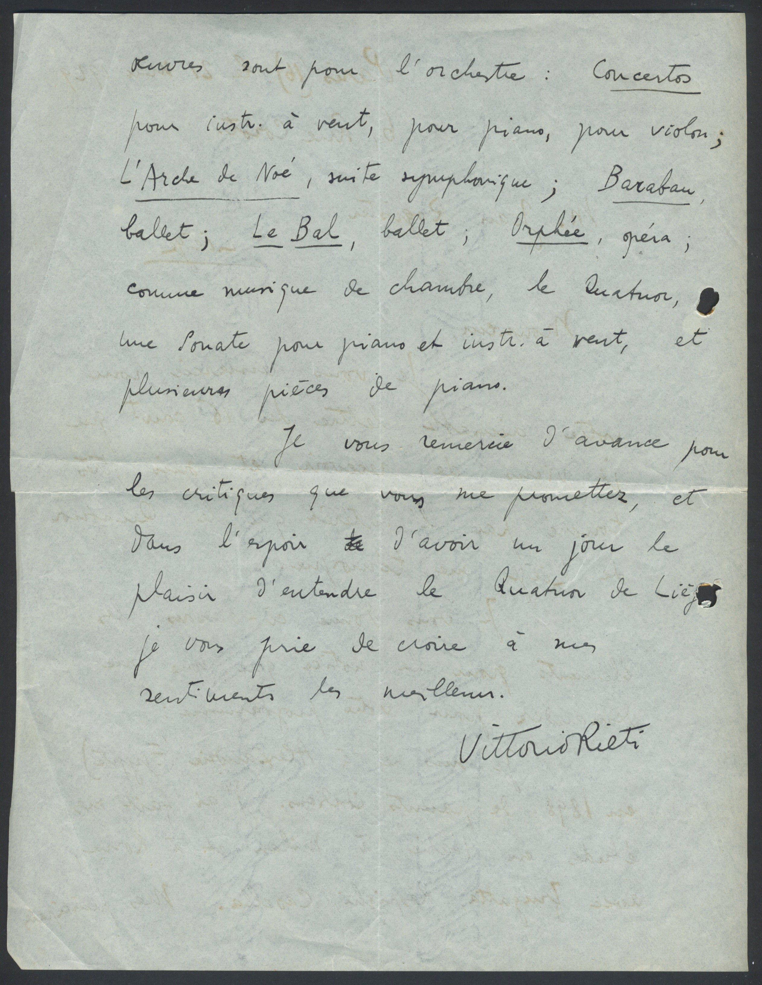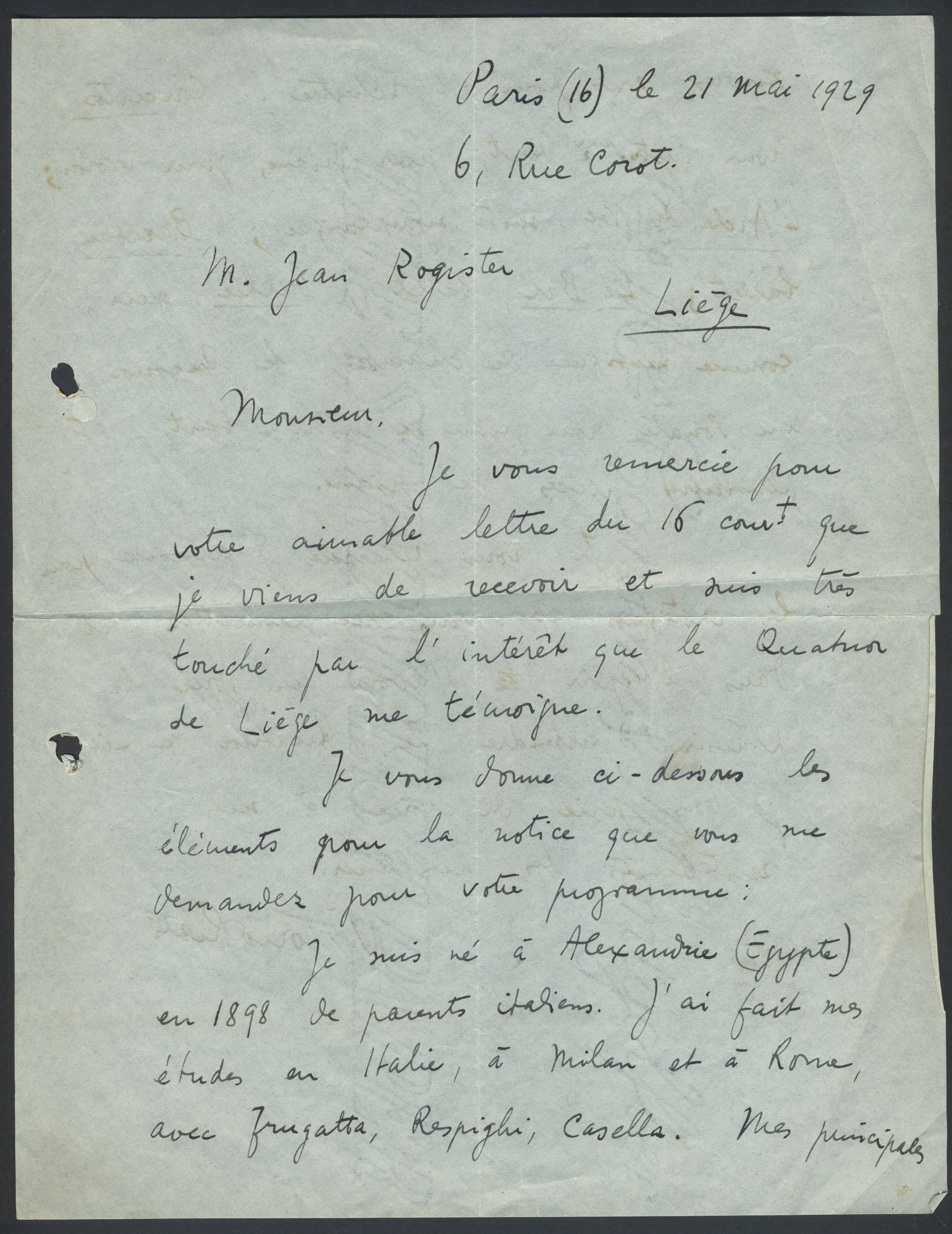 Autograph letter from Italian composer Vittorio Rieti, giving details of his biography for use in the programs of the Quatuor de Liège. May 21, 1929, 2 pp.