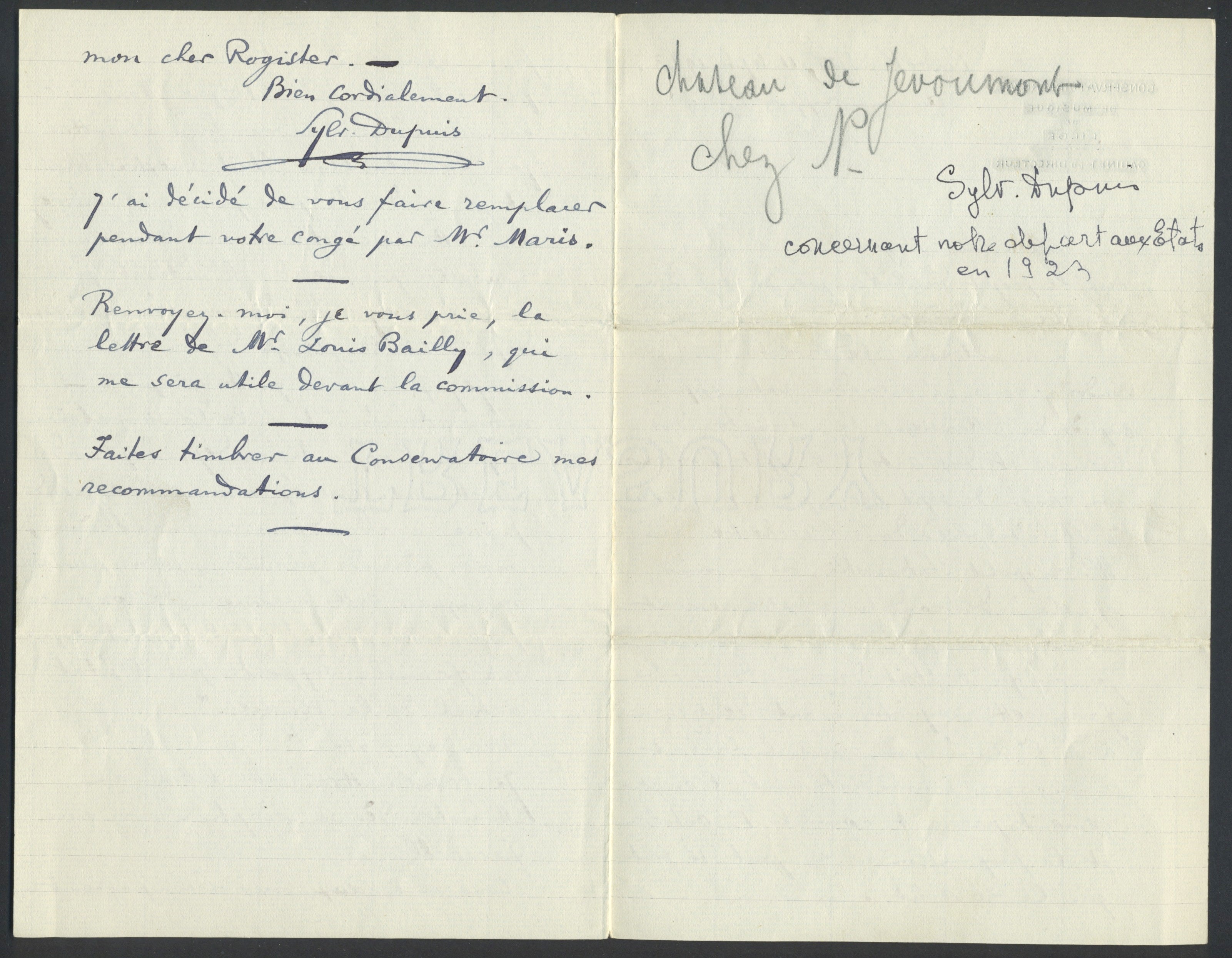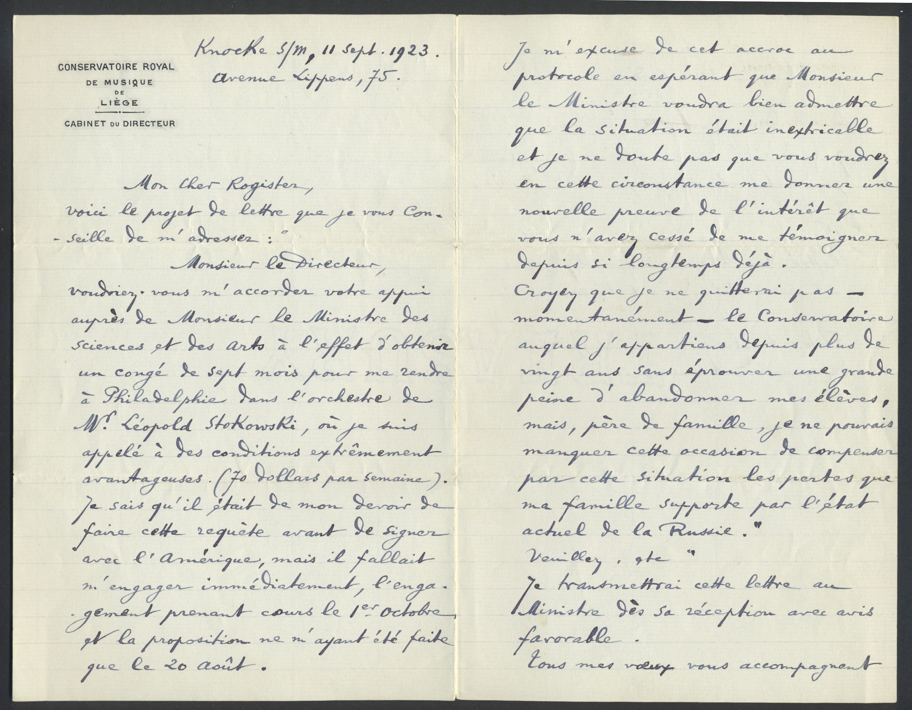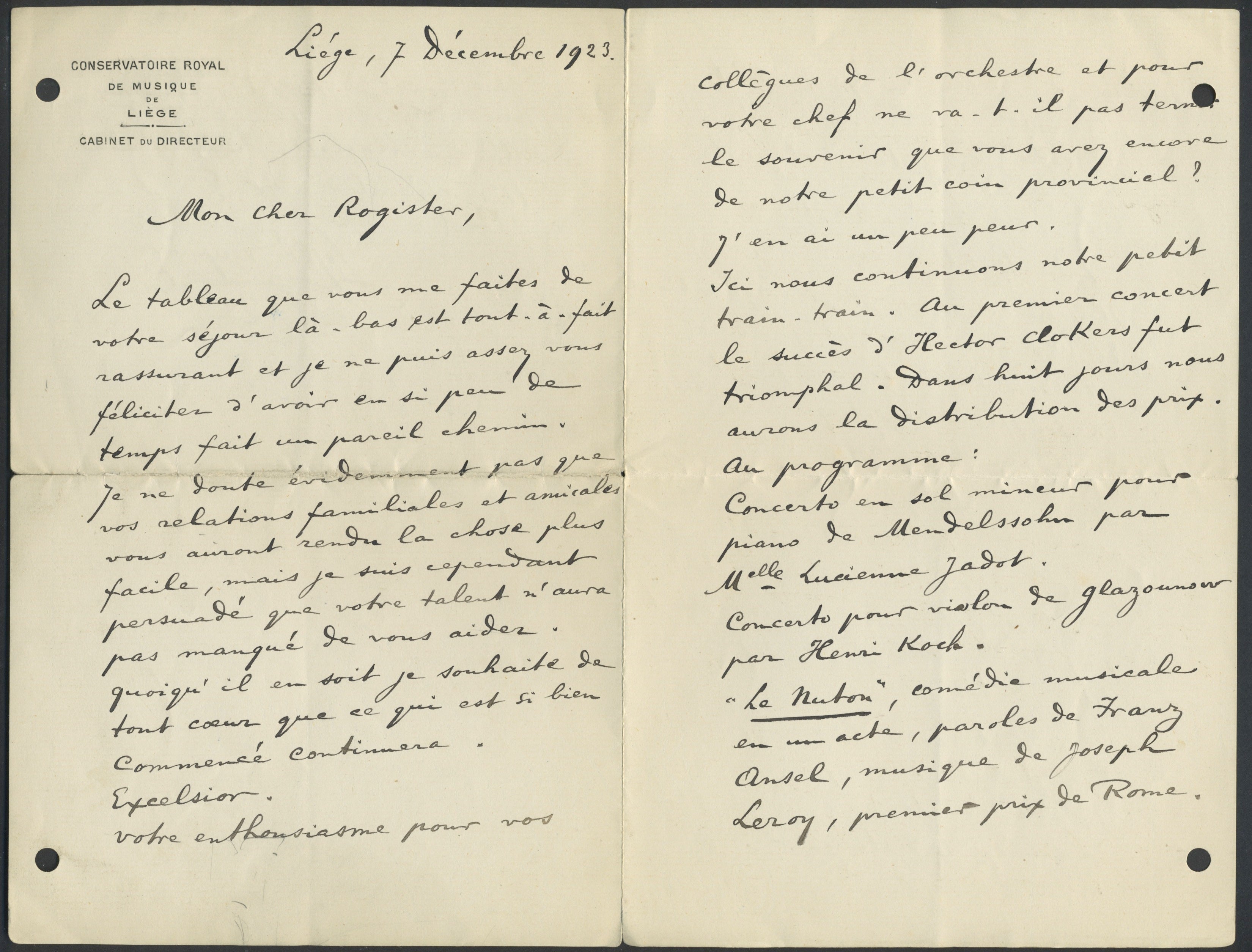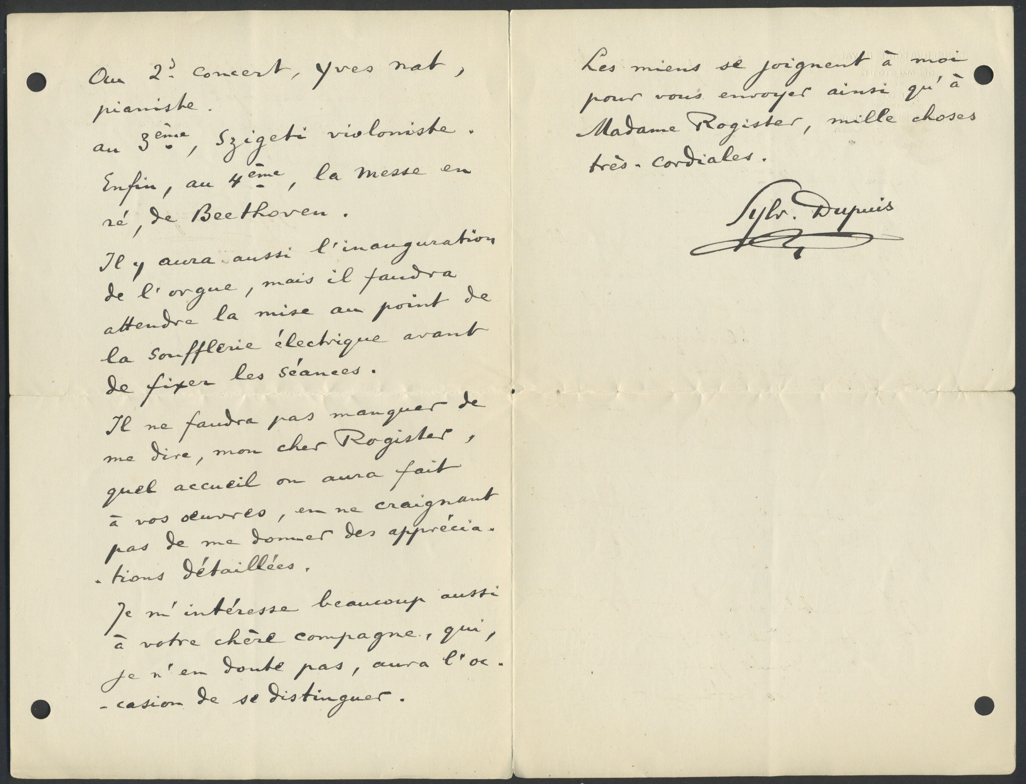 Two autograph letters from Belgian conductor and composer Sylvain Dupuis, the director of the Royal Conservatory of Liège. September 11, 1923 (3 pp.); December 7, 1923 (4 pp.). Dupuis gives the text of a letter which he advises Rogister to write, requesting a leave from the Royal Conservatory to play with the Philadelphia Orchestra; congratulates Rogister on his successful time in Philadelphia; and gives the program for an upcoming concert.