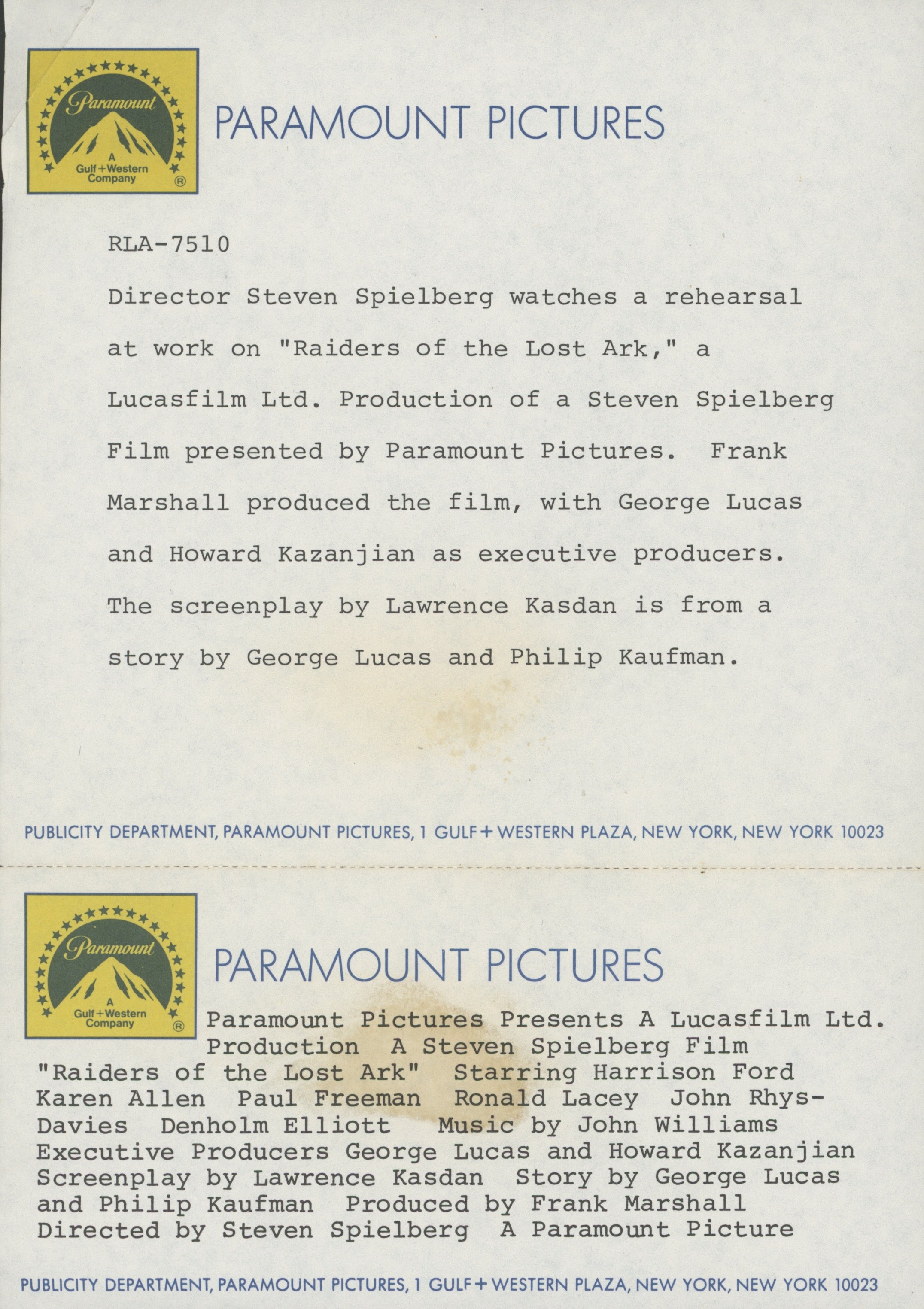 Paramount promotional photograph of the American director, the most commercially successful director in the history of film, who has signed his name in black ballpoint to the lower right corner. The accompanying press blurb reads, in part, "Director Steven Spielberg watches a rehearsal at work on Raiders of the Lost Ark." In very fine condition. 8 x 10 inches (20.3 x 25.4 cm.).
