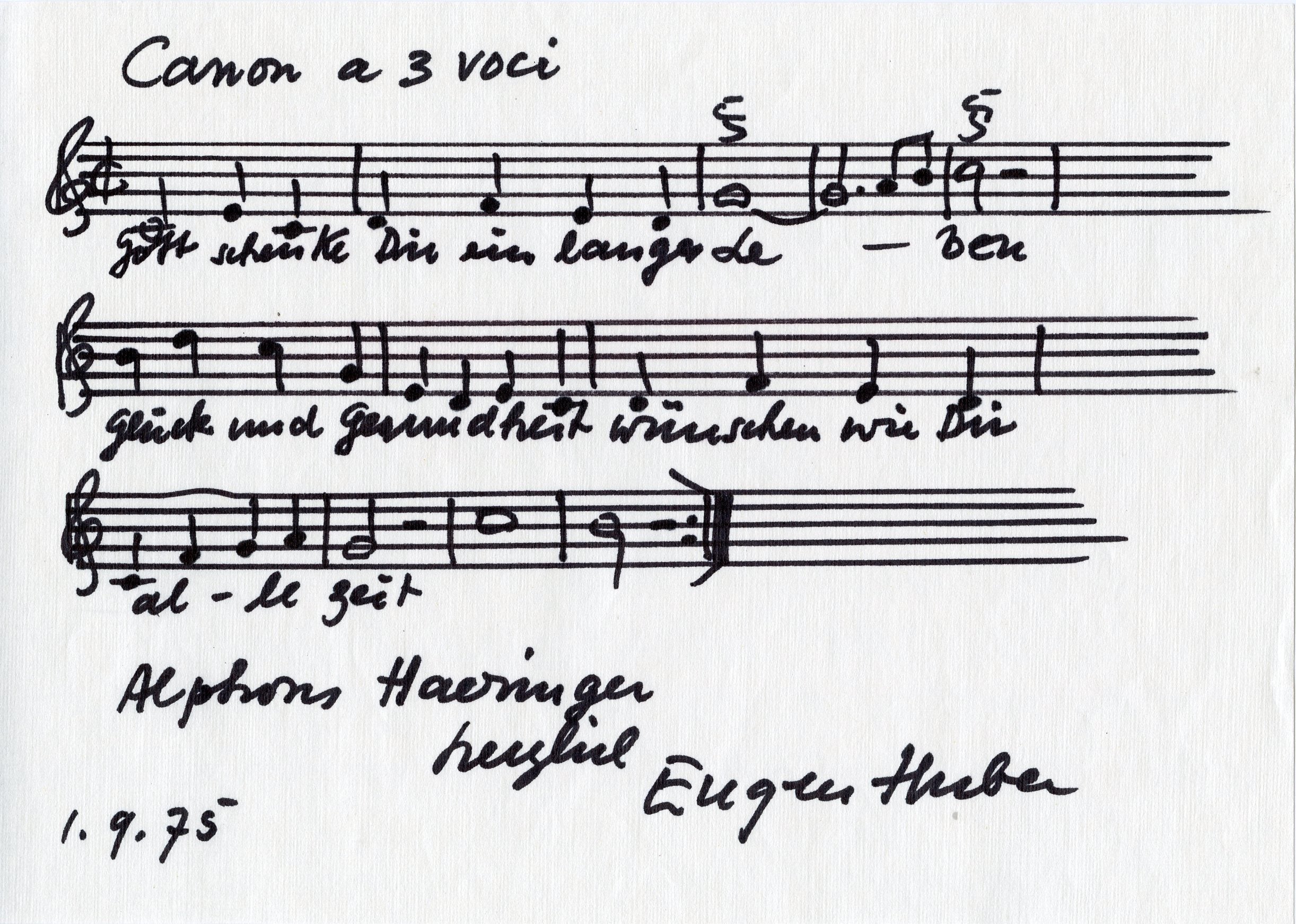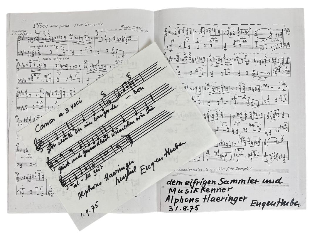 Two items from the Swiss composer and pianist with inscriptions in German: 1 musical autograph (canon a 3 voci, dated and inscribed to Swiss collector Alphons Haeringer, 9/1/1975) and 1 photocopy of Huber's "Piece pour piano pour Georgette," dated 9/13/1956 and inscribed to Haeringer on 8/31/1975. 15 x 10 inches; 8.2 x 5.6 inches. In fine condition.