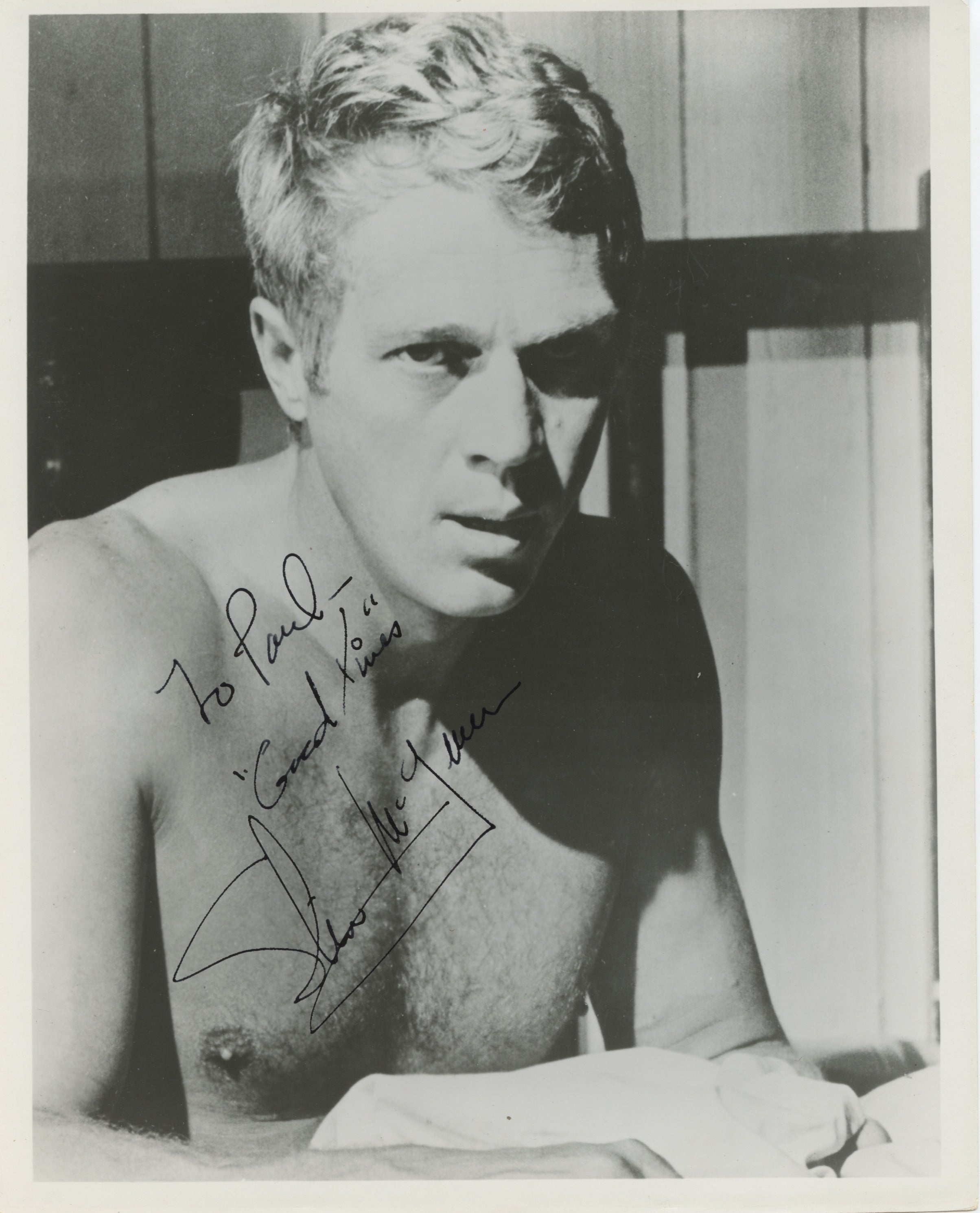 McQueen, Steve. (1930 - 1980). Signed Barechested Photograph of "The King of Cool". Rare signed photograph of one of the most revered actors of his generation, an Oscar-nominated performer who helped define the meaning of “cool” and who is remembered nearly as much for his wild antics and lifestyle and for his roles in Papillon, Bullitt, The Thomas Crown Affair, The Sand Pebbles, The Cincinnati Kid, The Great Escape, and The Magnificent Seven. Vintage black and white still photo of McQueen in the 1965 American drama "Baby the Rain Must Fall," signed and inscribed "To Paul - / 'Good Times' / Steve McQueen." In very fine condition. 8 x 10 inches (20.3 x 25.4 cm.). An uncommon example from a Hollywood legend quite elusive in signed photos!