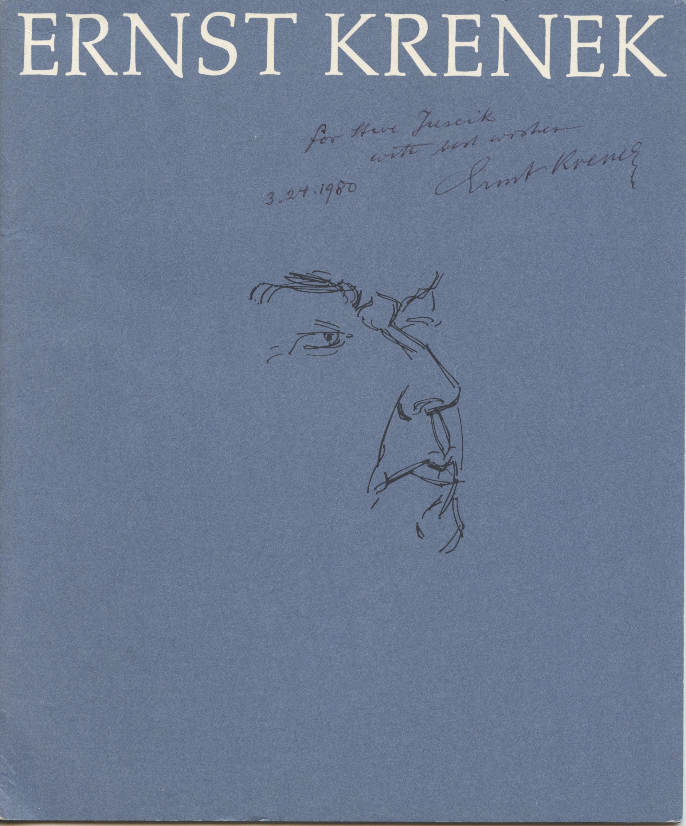 Signed brochure, 20 pp. lavishly produced with biographical materials, photographs and works list, promoting the Austrian-American composer. Issued by BMI, ca. 1968. Inscribed, "for Steve Juscik / with best wishes / Ernst Krenek / 3.24.1980" to cover. 9 x 7.5 inches (22.8 x 19 cm). In fine condition.