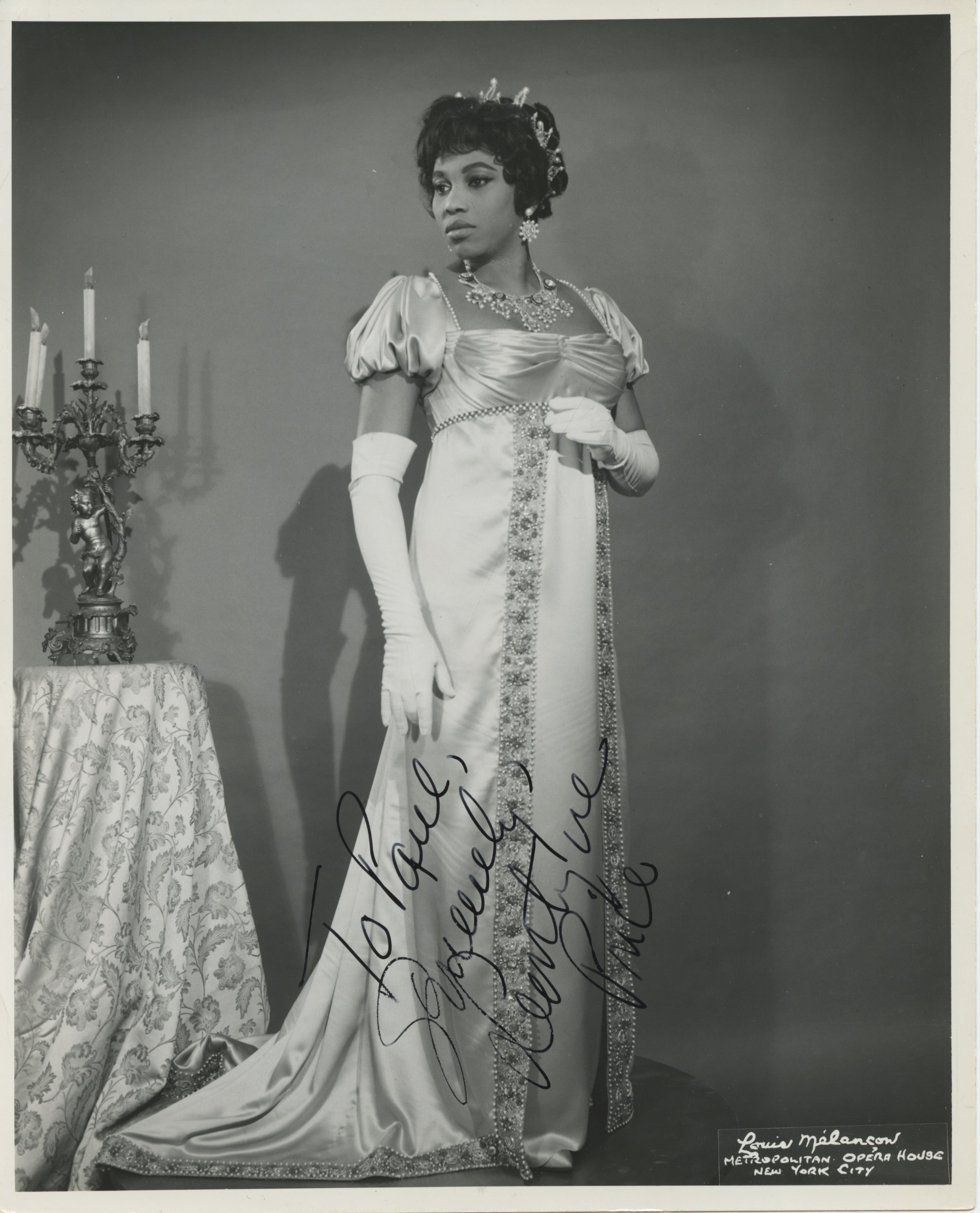 Signed 1962 portrait of the legendary American soprano, one of the first Black singers to become an internationally acclaimed diva in classical music, both in opera and in concert, in the title role of Puccini's Tosca. By Louis Mélancon, Metropolitan Opera, New York. Inscribed to Paul McMahon. 10.25 x 8.25 inches (25.4 x 20.6 cm). In fine condition.