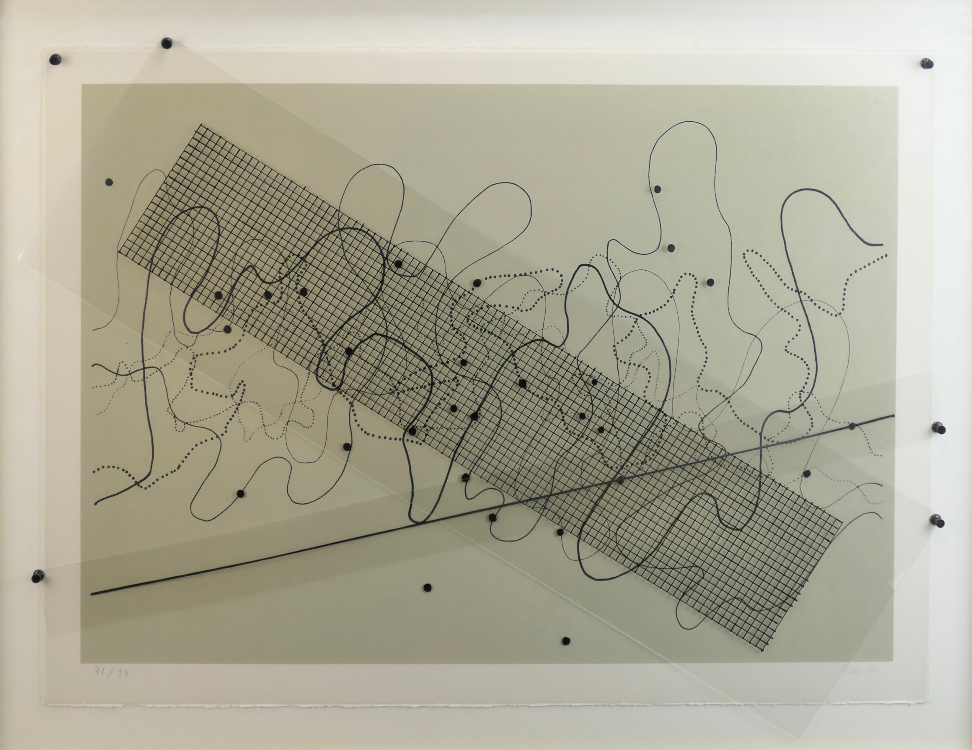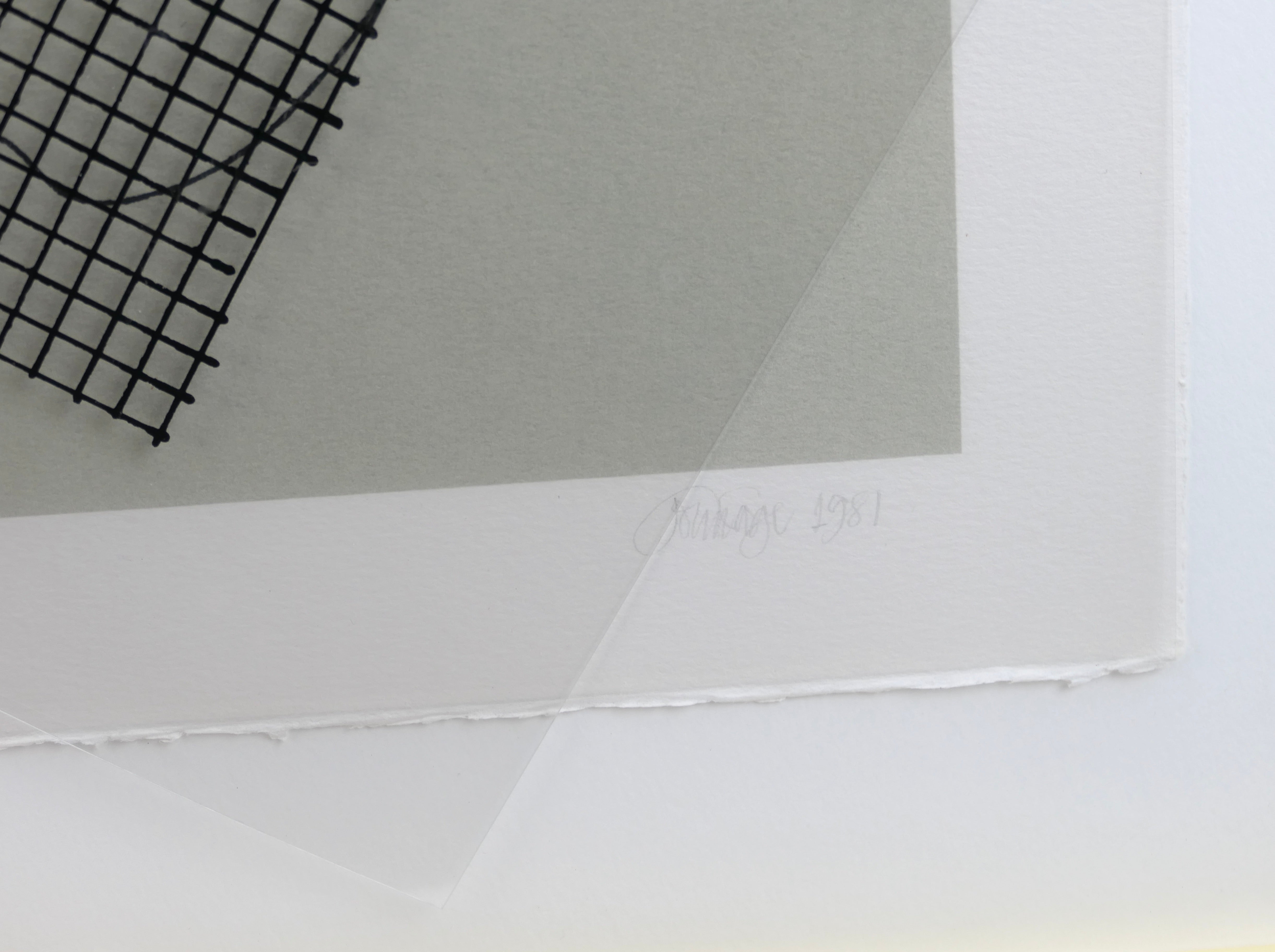 Screenprint on Arches paper, with celluloid (mylar) templates printed in black ink, hand signed by Cage to the lower right and numbered 71 of 97 impressions lower left. Printed in 1981. 19.5 x 27.25 inches; 27 x 35 inches framed. Some very light staining on the verso, otherwise fine. Provenance: The Museum of Contemporary Art, Los Angeles 1994; Chuck Fries, Godfather of the Television Movie, and Ava Fries Estate, Beverly Hills