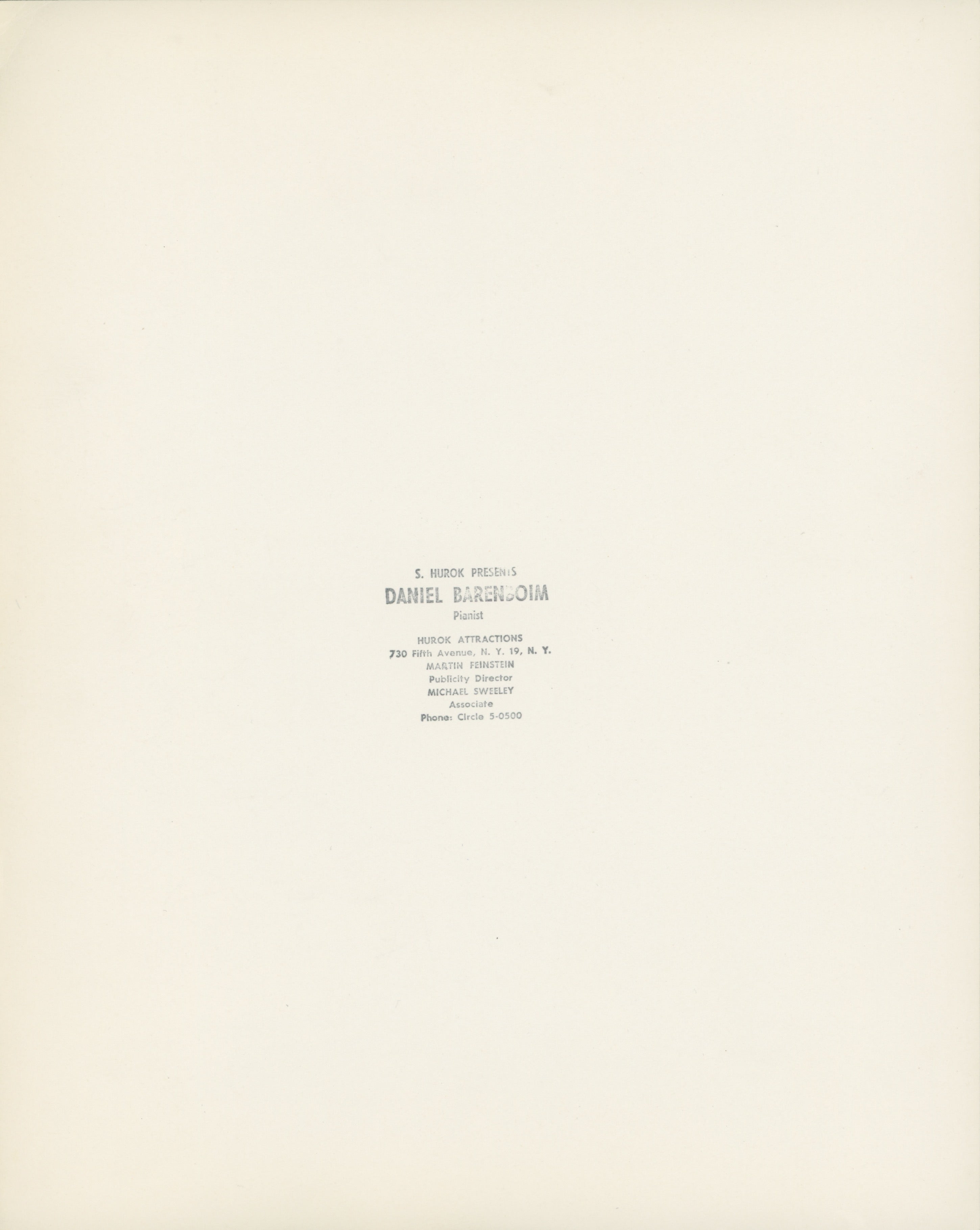 Early signed photograph of the pianist and conductor, who has boldly inscribed "To Paul, / with all good wishes / Daniel Barenboim" in black felt tip.  S. Hurok Presents stamp to verso.  In fine condition.  8 x 10 inches (20.3 x 25.4 cm.).