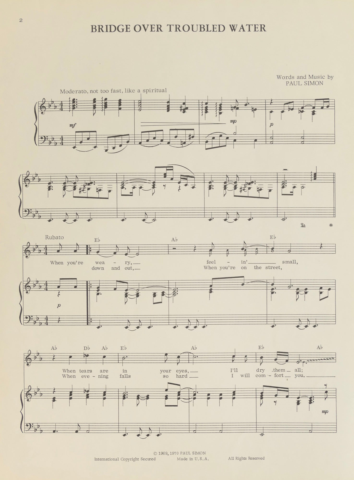 Unbound upright quarto of the title song from the duo's last studio album. Self-published ("Copyright Paul Simon 1969, 1970") but distributed by Charing Cross Music, New York. 4 pp. Same cover photo as the album. Minor creases.