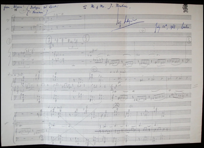 Dallapiccola, Luigi. (1904–1975). Important Autograph Manuscript, "Ulysses." . Oblong autograph musical manuscript in pencil on printed ruled manuscript paper, 22.5 x 32.5 cm. Title with date, inscription and dedication at head of first page, in blue ink: "from 'Ulysses' (Prologue, 3rd Episode) ['Nausikaa'] to Mr. & Mrs. J. Ferntree, Luigi Dallapiccola / July 12th, 1967, Berlin." Full score music, p. 1 - 4. With the original transmissal envelope, addressed by the composer and bearing a second signature in the return address. Both items dated before the the premiere of the work in Berlin later that year.