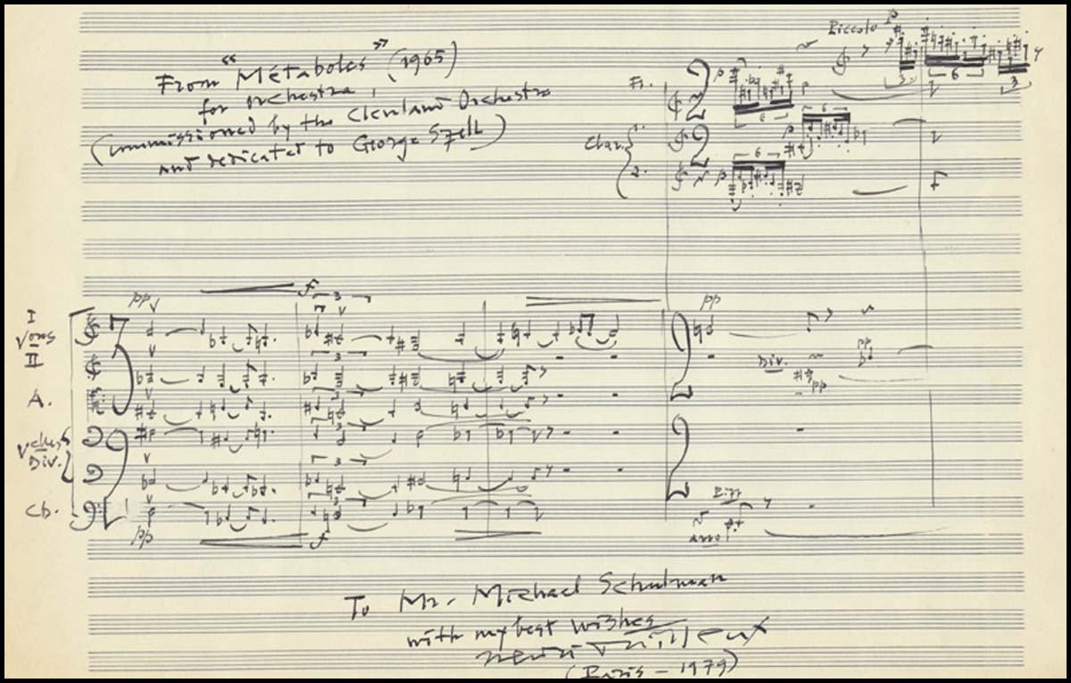 [20th Century Composer Musical Quotations] Dutilleux, Henri. (b. 1916). "Métaboles" - Autograph Musical Quotation. Lengthy detailed AMQS identified by the composer as "From ‚Métaboles‘ (1965) for orchestre (commissioned by the Cleveland Orchestra and dedicated to George Szell)," signed and inscribed in Paris, 1979. 29.5 x 18.5 cm. Very fine.