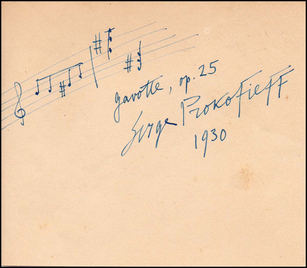 Prokofiev, Sergei. (1891-1953). "Classical Symphony" - Autograph Musical Quotation. Autograph musical quotation signed and dated 1930. 2 bars from the "Gavotte" of the composer's Symphony No. 1 in D major, Op. 25, the "Classical" symphony. 14 x 12 cm. Fine.