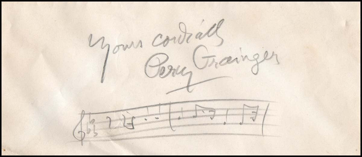 Two-measure AMQS in pencil from the well-regarded Australian-born pianist, conductor, and composer best known for his folk settings and colorfully experimental works. A quotation from his his arrangement of the English folk tune "Country Gardens," inscribed "yours cordially / Percy Grainger" on an envelope 22.5 x 10 cm. Small creases lower left, else fine.