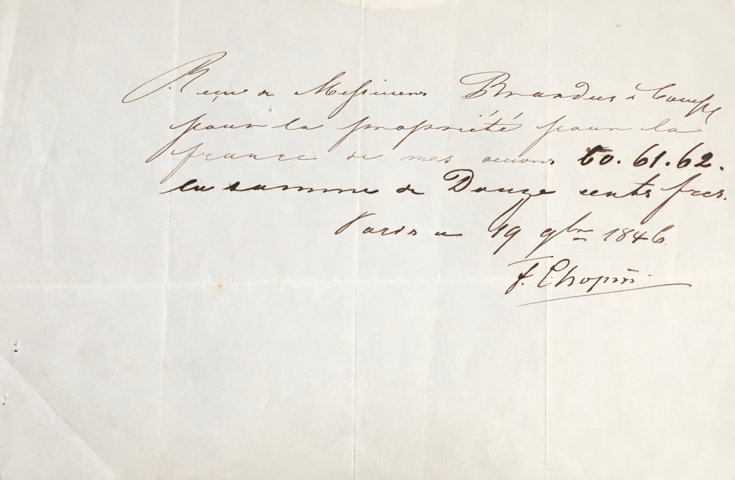 1 page. Paris, November 19, 1846. 21 x 13.5 cm. The handwritten document in French, prepared by a representative of the publishing company, signed by the composer "F. Chopin." "Recu de Monsieur Brandus...pour la propriete pour la France de mes oeuvres 60, 61, 62l la somme de Douze cent francs. Paris le 19 9bre [=Novembre] 1846." In fine condition. A great rarity.