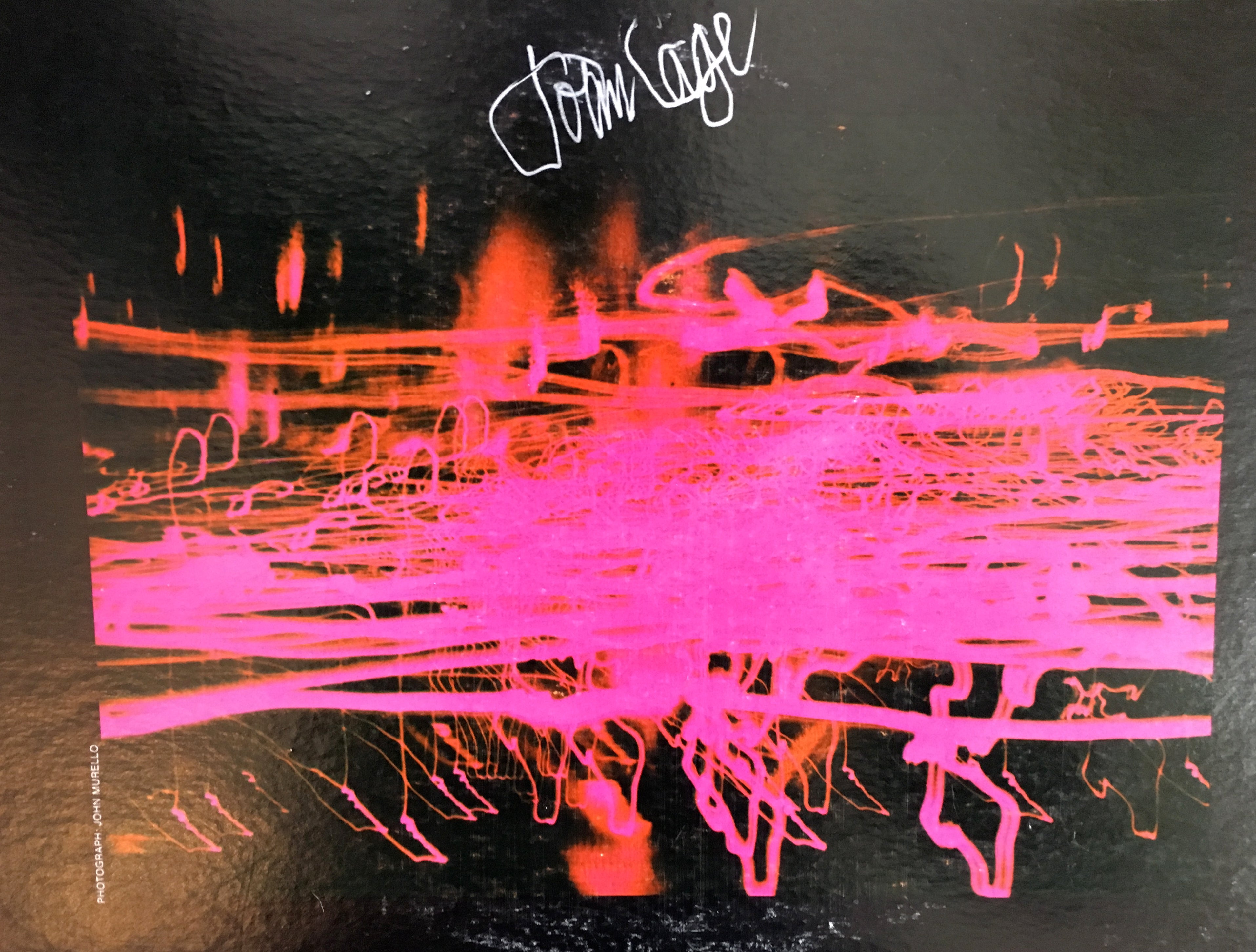 Original 1967 LP of electronic music by groundbreaking composers John Cage, Luciano Berio, and Ilhan Mimaroglu, signed on the cover by Cage. The record features a realization of Cage's Fontana Mix for magnetic tape, Berio's Visage for magnetic tape, based on the voice of Cathy Berberian and other sounds, and Mimaroglu's Agony. The striking cover, with electronic designs in shocking pink on black, has been signed in silver by Cage. Cover in very good condition with a notation in ink on the verso, LP near mint.