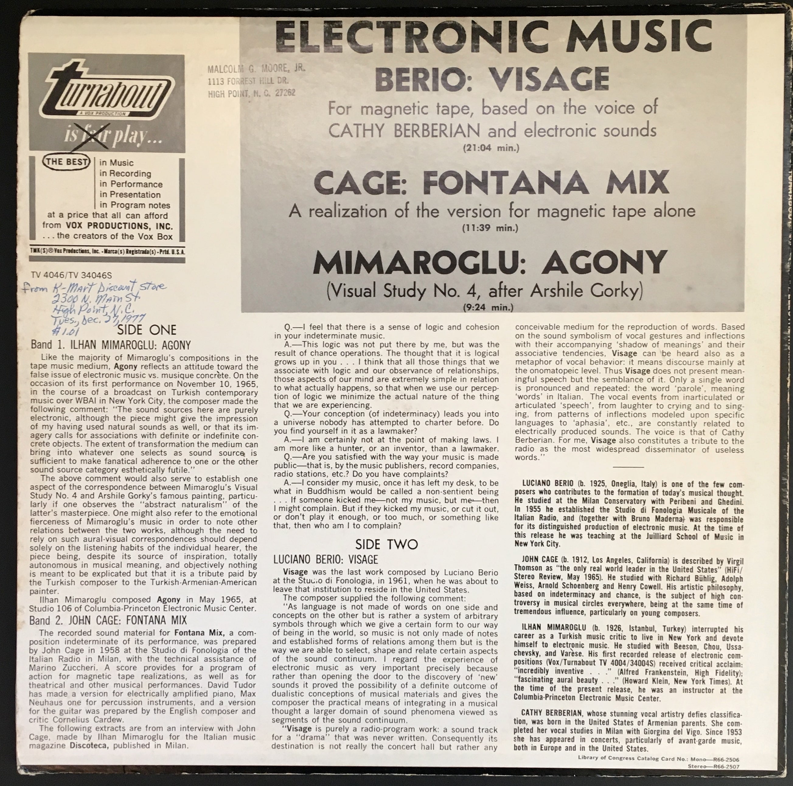 Cage, John. (1912–1992) [Berio, Luciano. (1925–2003) & Mimaroglu, Ilhan. (1926–2012)]. "Electronic Music" - SIGNED LP.