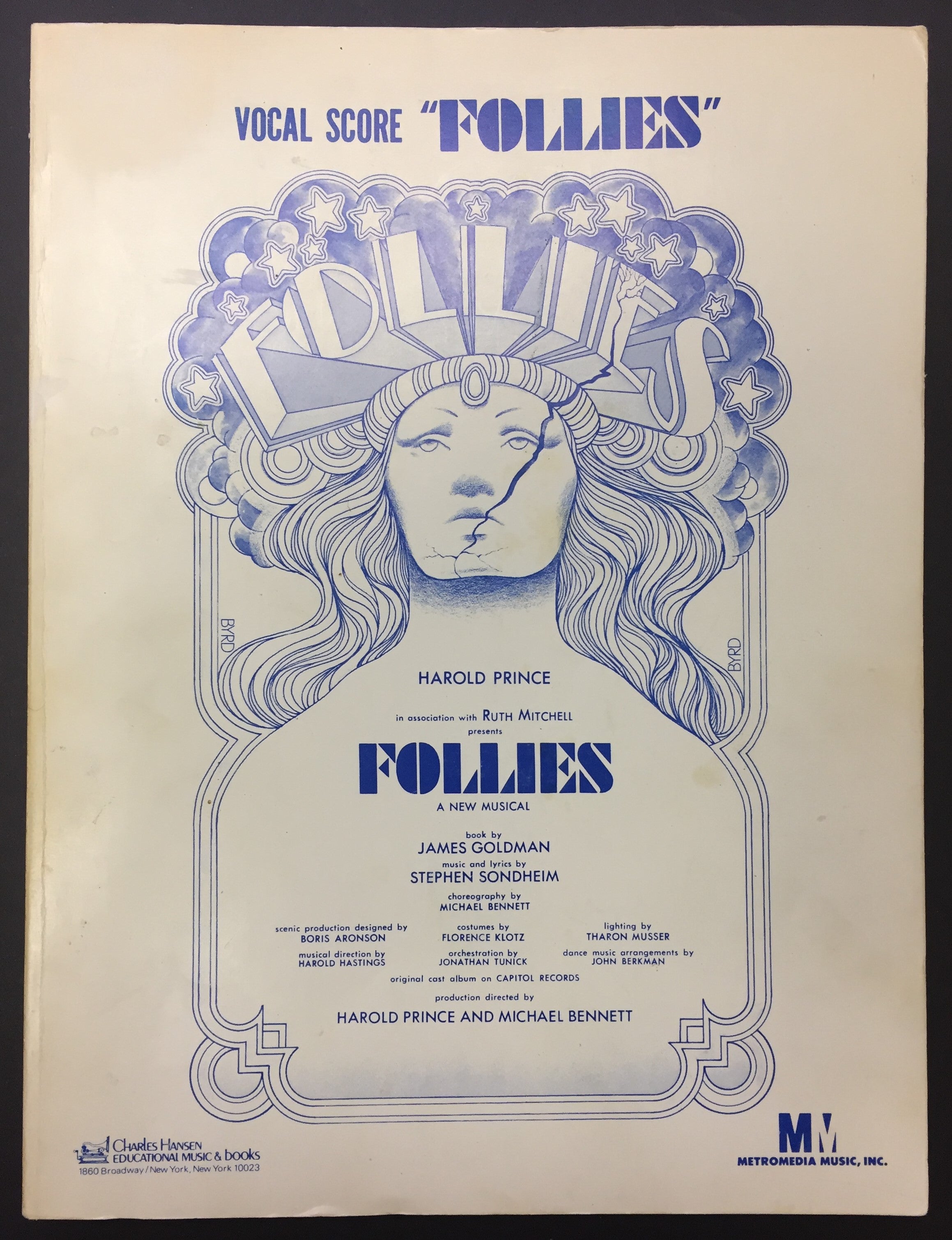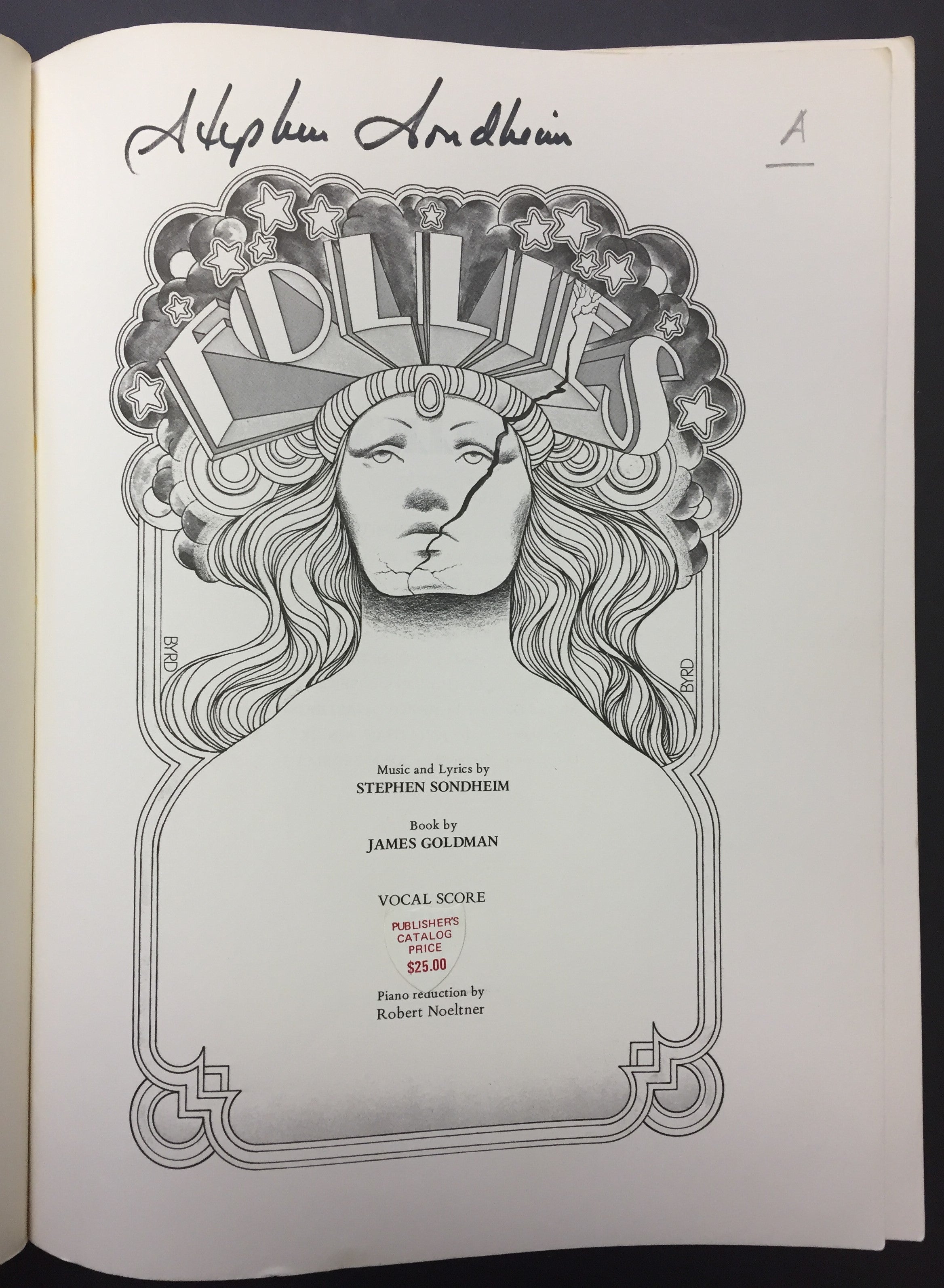 Sondheim, Stephen. (1930–2021). "Follies" - SIGNED VOCAL SCORE. New York: Charles Hansen. 1974. Vocal score to the 1971 musical, boldly signed on the title page by the composer and lyricist. 265 pp. Softcover. Light external toning, some wear to the spine and light shelf wear, hard diagonal crease to upper right corner intersecting the edge of the image, and a smaller same corner crease to blank margin (neither visible in the images but very visible in person). 9 x 12 inches (22.7 x 30.1 cm).