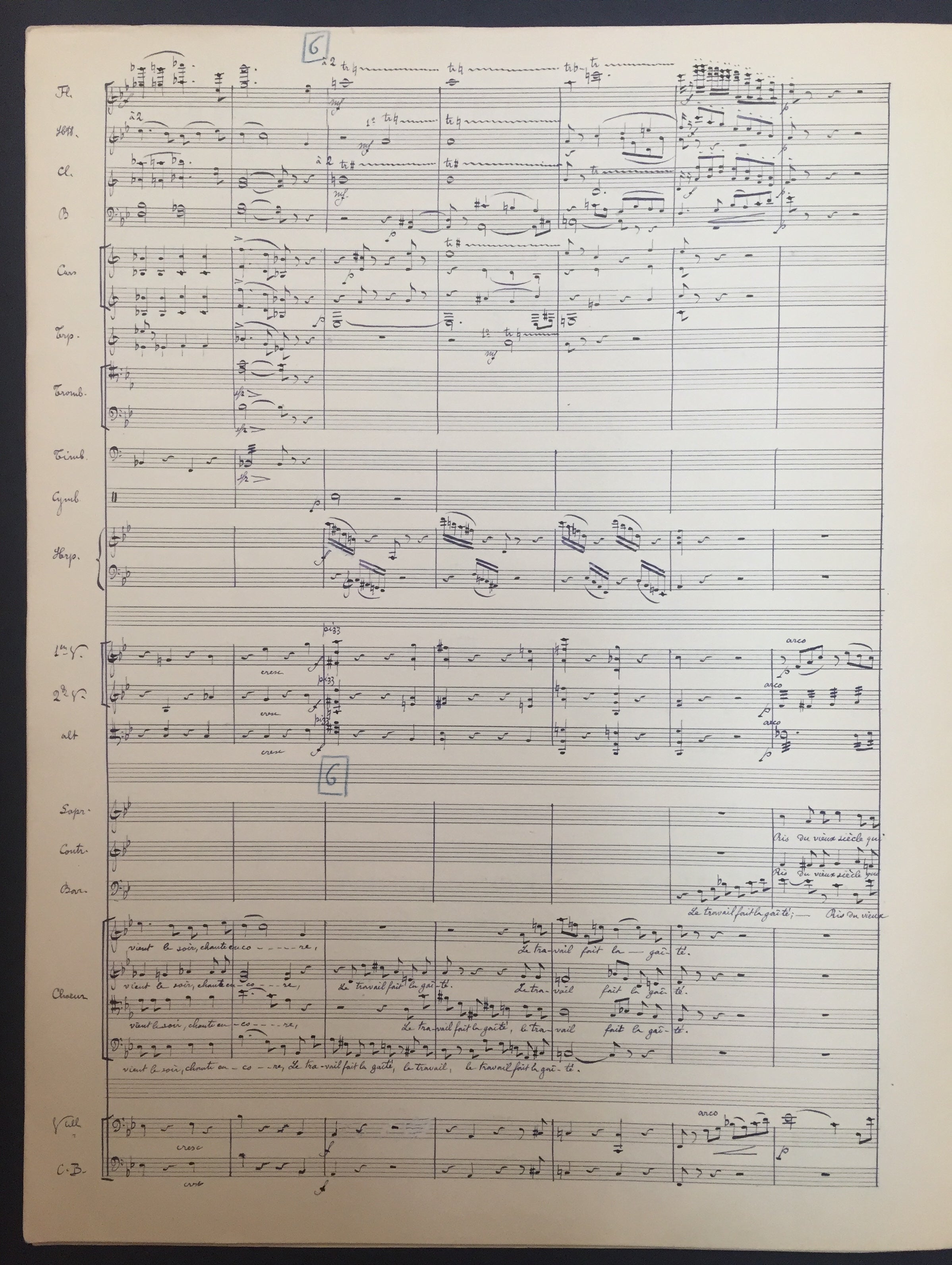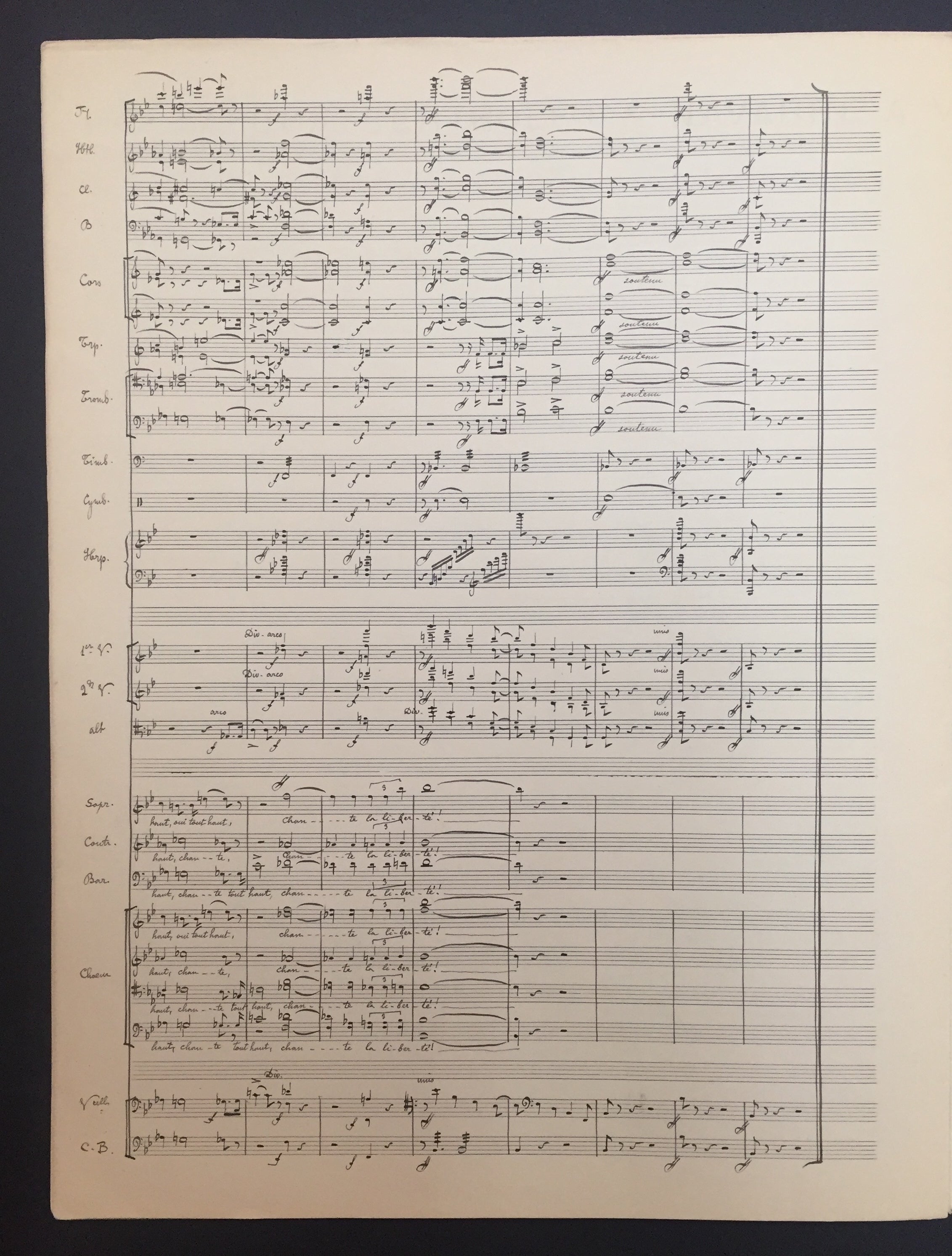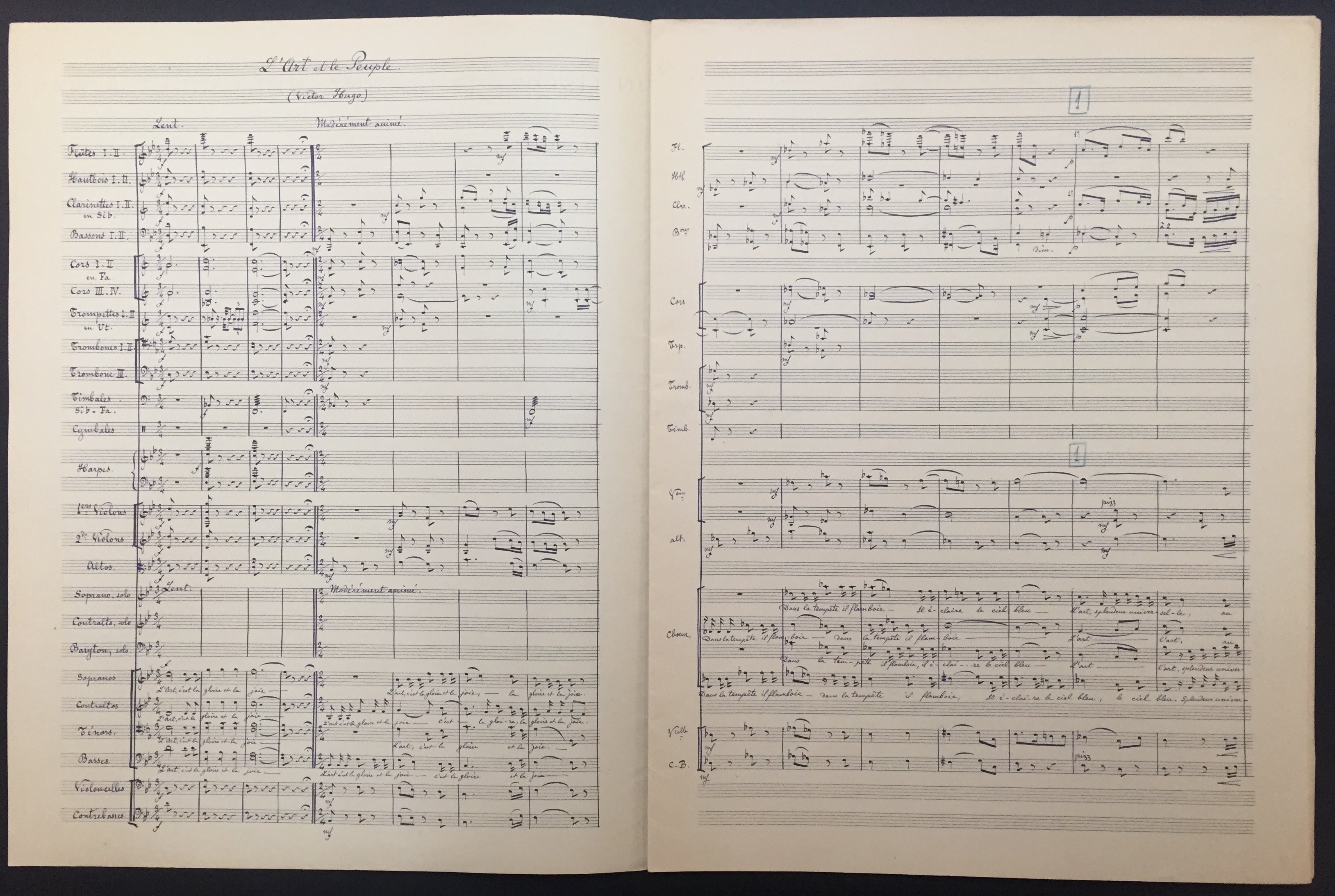 Autograph musical manuscript of the important French composer's work for choir and orchestra, L'Art et le Peuple. N.d. [ 1918]. Very neatly penned manuscript score in black and blue ink, scored for SATB choir, soprano, alto, and baritone soloists, and full orchestra. 25 staves per system, penned over 13 pp. Rehearsal numbers added in blue pencil. Light toning, slight corner crease to the back page, not affecting the music; overall very fine. 10.5 x 13.75 inches (27 x 35 cm). A rare manuscript from the great French musician - organist, timpanist, chorus master, conductor, author and teacher!