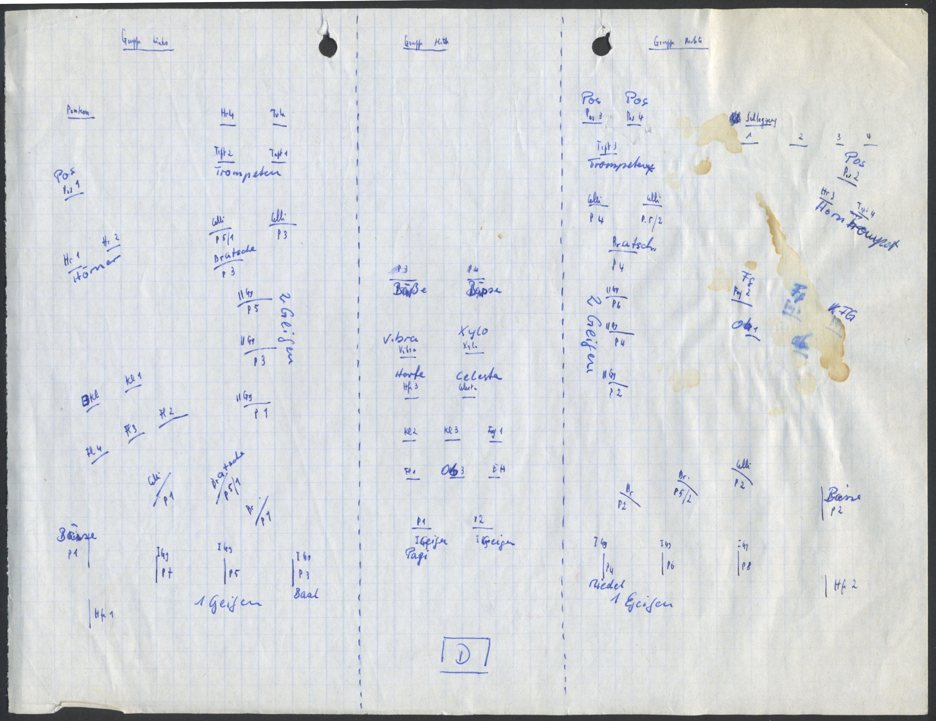 Autograph document in the hand of the important composer and conductor, showing the orchestral seating plan for his work Figures (1958–66). Undated [likely Baden-Baden, 1985.] In his tiny and precise hand, Berlioz has mapped out the seating plan for the three separate instrumental groups. Another hand has enlarged some of the words to make the plan more easily legible. An interesting and visually striking document. 1 p. on hole-punched graph paper. Light stains at the right, with light edge wear; overall very good. 10.5 x 8 inches (27 x 20.8 cm).