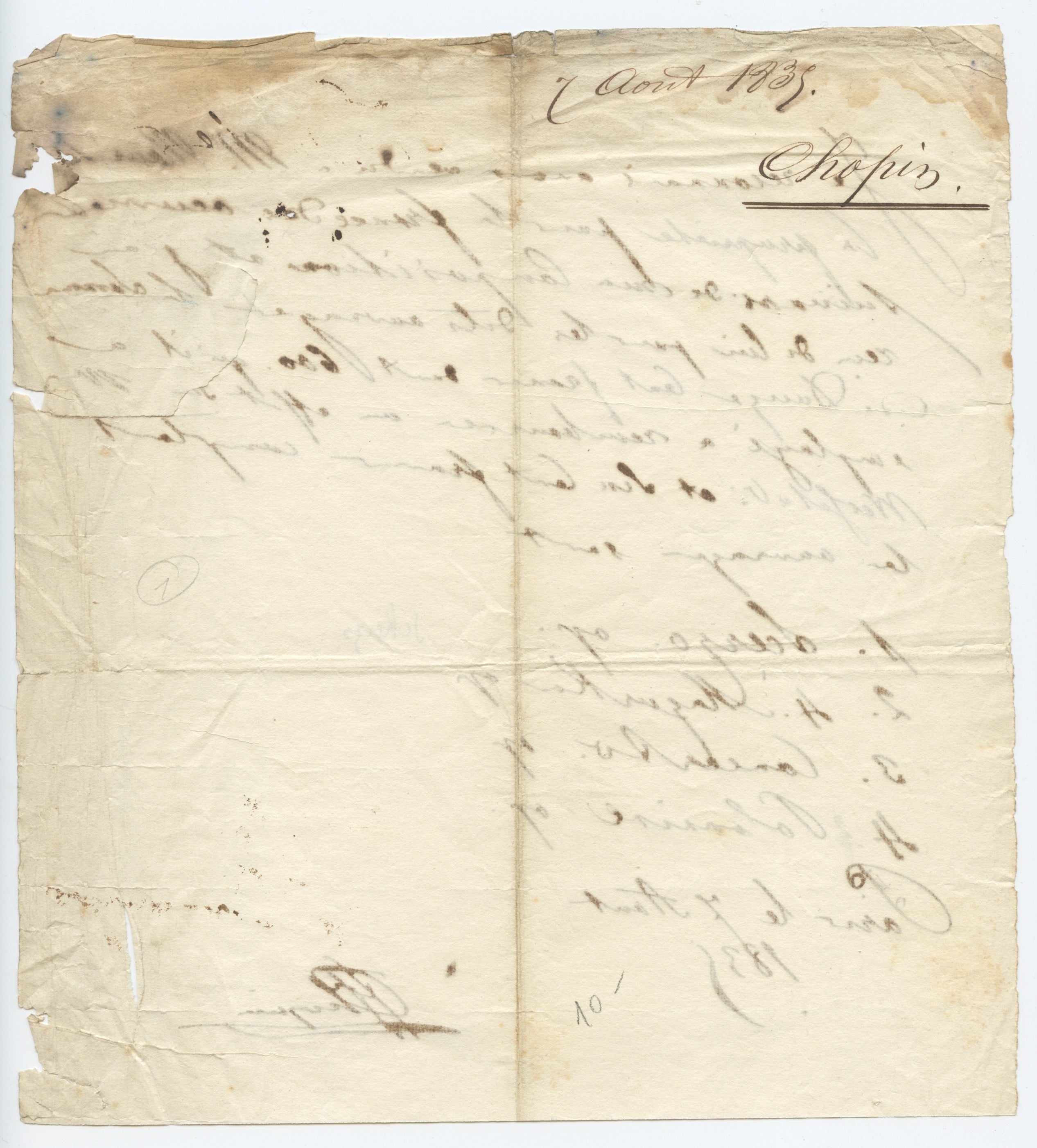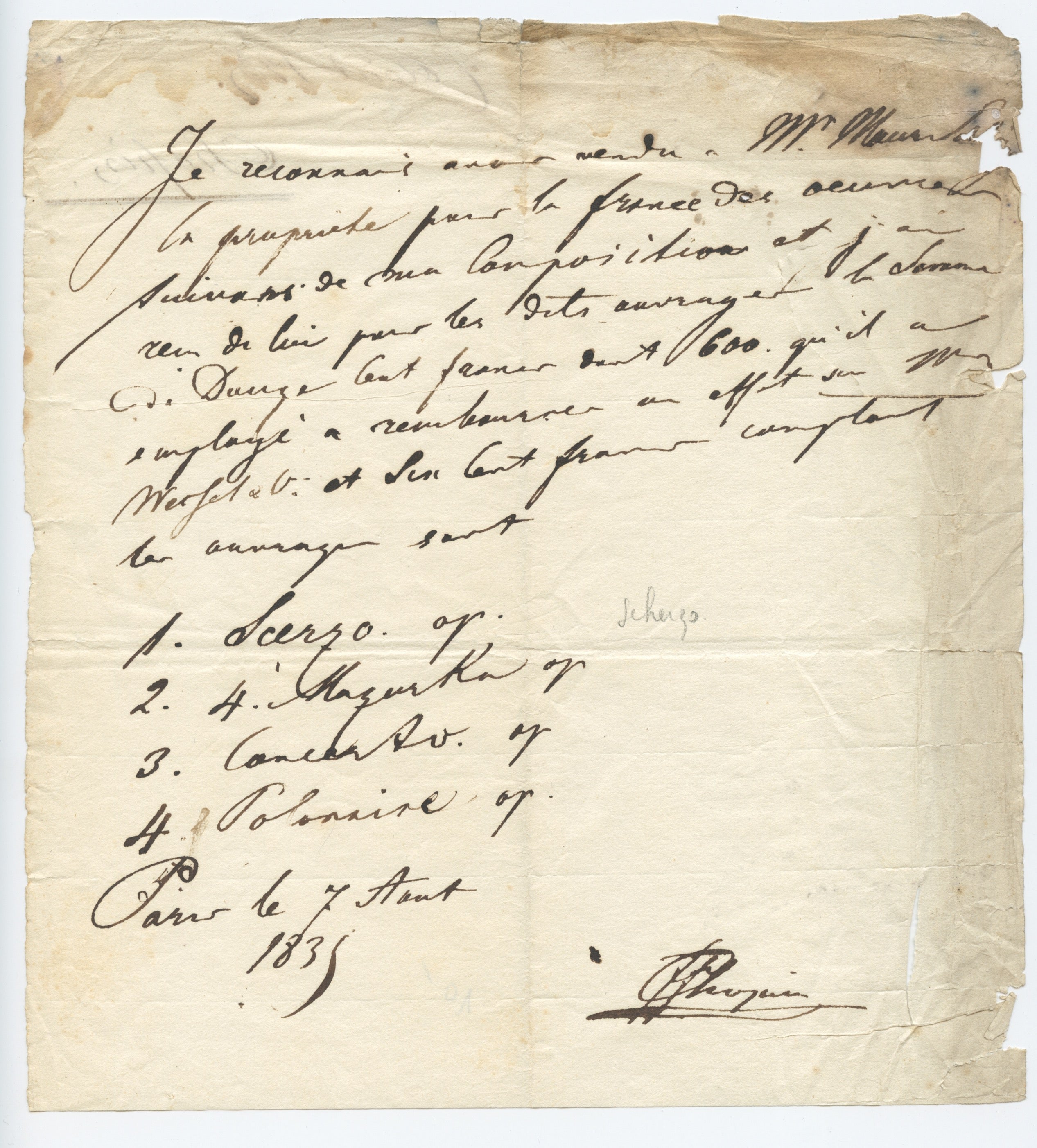 Chopin, Frédéric. (1810–1849). Signed French Copyright Agreement for the Publication of his Op. 20 Scherzo , Op. 21 Piano Concerto, Op. 22 Grand Polonaise and the Mazurkas Op. 24. Very rare signed document from the Polish composer and pianist, recording the sale of the French copyright to the Parisian publisher Maurice Schlesinger for some of his most celebrated works: the Scherzo No. 1 in B minor Op. 20, the Piano Concerto in F minor Op. 21, the Grand Polonaise in E-flat major Op. 22, and the four Op. 24 Mazurkas. 1 page. Paris, August, 1835. 20.5 x 22.5 cm. The handwritten document in French, prepared by a representative of the publishing company, signed by the composer in full "F.F. Chopin." "Je reconnais avoir vendu a Mr. Maur. Sch..ger la propriete pour la France des oeuvres suivants de ma Composition et j'ai recu de lui pour les dits ouvrages la somme de Douze cent francs...les ouvrages sont // 1. Scerzo op. // 2. 4. Mazurka op. // 3. Concerto. op. // 4. Polonaise op. // Paris le 7 Aout / 1835." On laid paper, the verso with a later note from the Publisher "7 Août 1835 Chopin." Upper margin stained, various creases and some small losses along the right edge, affecting two words, else fine. A great rarity.