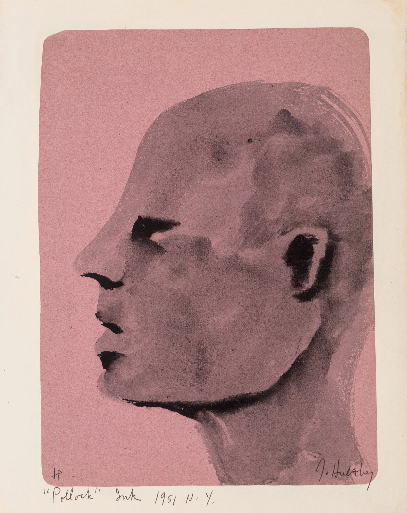 Watercolor on pink paper, signed initialed, dated, titled, and inscribed along bottom edge: "JH J. Hultberg / 'Pollock' Ink 1951 NY." 11.75 x 8.75 inches (29.8 x 22.2 cm). Light discoloration with very minor toning and soiling along edges; soft handling creases, most notably on in margins; sheet is secured to backing board with archival corners; matted to 20 x 15.75 inches. Unframed.