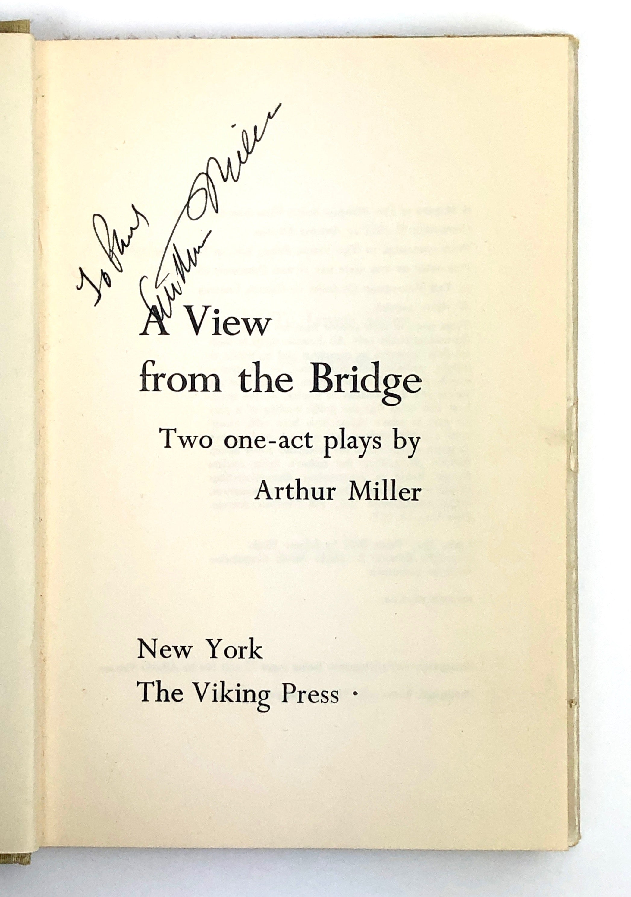 Miller, Arthur. (1915–2005). A View from the Bridge - SIGNED. New York: The Viking Press. [1955]. First edition. Signed and inscribed by Miller on the title: "To Paul / Arthur Miller." 160 pp. 8vo. Original cloth-backed boards. Fine copy in original dust jacket with some edge wear and small tears.