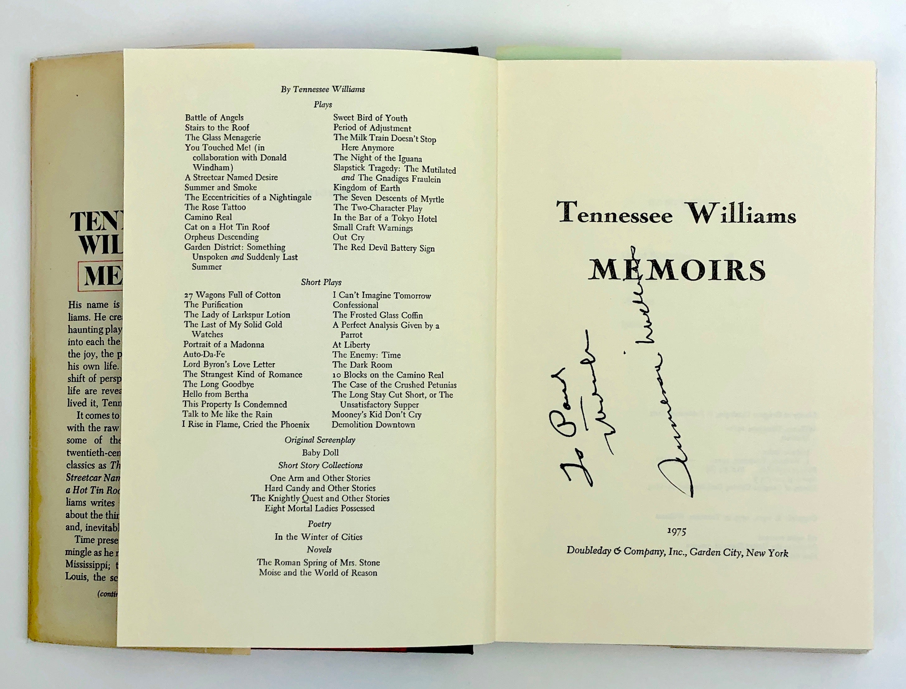 Williams, Tennessee. (1911–1983). Memoirs - SIGNED. New York: Doubleday & Company, Inc.. 1975. First Edition.