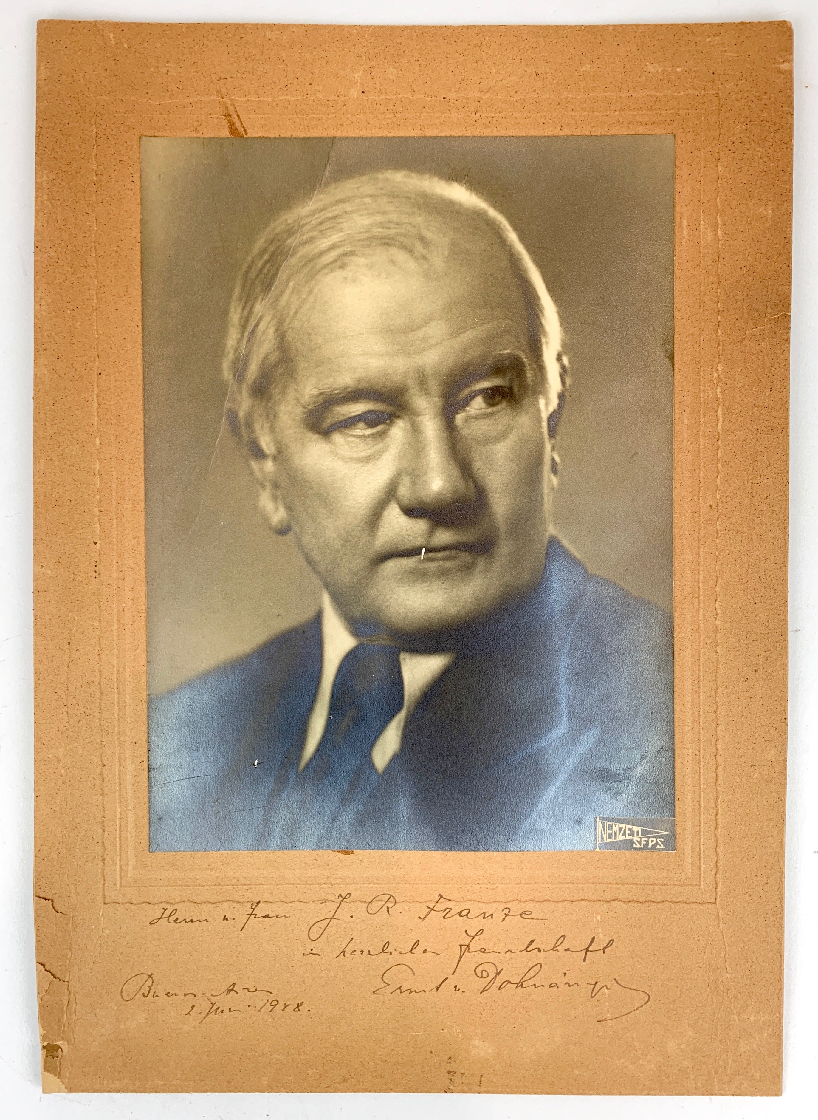Dohnányi, Ernö. (1877–1960). Signed Photograph. Original Nemzeti S.F.P.S. of Budapest bust portrait photograph of the important Hungarian composer, conductor, and pianist. Dohnányi has inscribed to the musicologist Johannes Franze and his wife "in herzlichen Freundschaft / Ernst de Dohnanyi / Buenos Aires / 2.Juli.1948" to the photographer's mount. Some silvering and scratches to image, and a diagonal crease through the upper left corner, aa few small nicks and creases to mount, else fine. Photograph 6.5 x 9 inches (16.5 x 22.7 cm.); overall 9.5 x 13.5 inches (24.1 x 34.3 cm.).