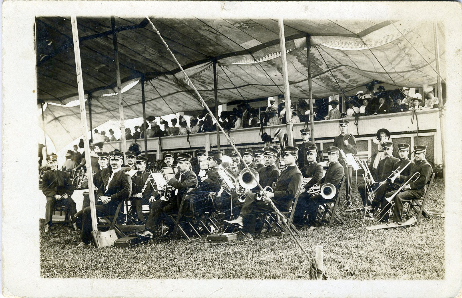 [Elgin Military Band] [Watchmaking]. Original 1908 Photograph Postcard. Original photograph postcard showing the military band of Elgin, IL, sponsored by the Elgin watchmaking company, taking a break in their seats under a large tent. Addressed and postmarked 1908 on the verso, with the note: "Elgin Military Band at Wheaton Country Fair. Aug. 25-29 - 1908." A crisp image in fine condition. 5.5 x 3.5 inches (13.7 x 8.9 cm).