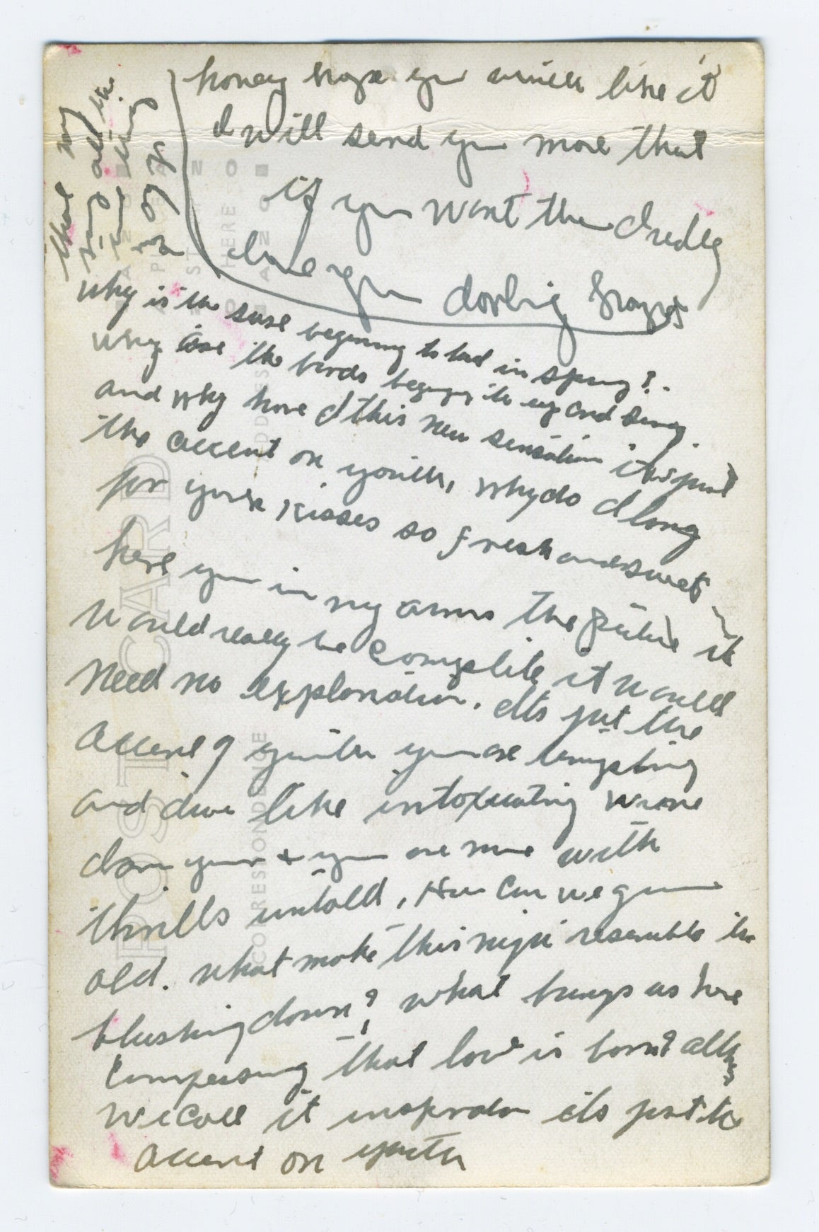 [Dancing Carl] [Vee Lawnhurst & Tot Seymour]. "To my darling sweetheart...the sweet girl in the world to me" – Postcard Love Note. Charming vintage postcard photograph by Kline Photo [no place, no date] of one Dancing Carl shown in a dance pose with arms extended front and backwards, one leg bent, the other kicked back, his name printed within the negative, inscribed by him in blue ink with a lengthy inscription on both sides. The smitten Carl, writes in part [all sic] on the recto, "Frum [Dancing Carl] To my darling sweetheart...the sweet girl in the world to me"; and to the verso, "honey hope you will like it / I will send you more that / if you want the....love you darling..." followed by the bulk of the lyrics to the 1934 Vee Lawnhurst & Tot Seymour song, "Accent on Youth," beginning "Why is the rose beginning to bud in Spring? / Why are the birds beginning to fly and sing? / And why have I this new sensation? / It's just the accent on youth! /Why do I year for kisses so fresh and so sweet?..."