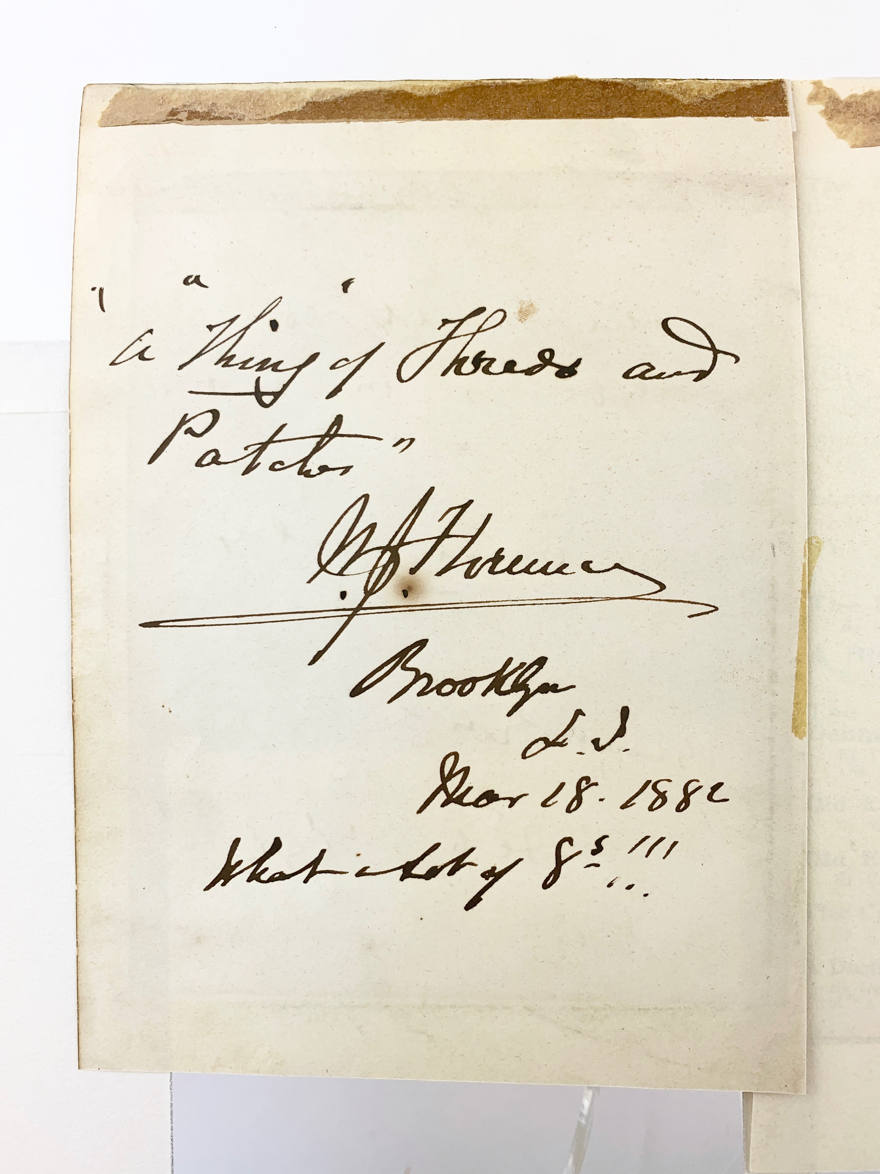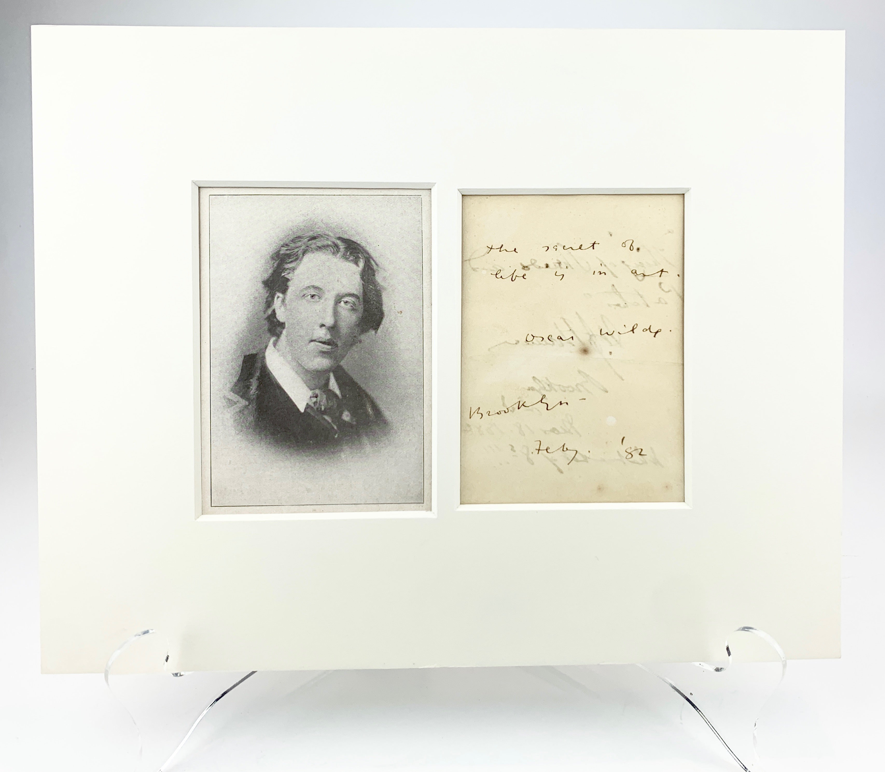 Autograph signed quotation from the Irish writer and leader of the Aesthetic Movement, who has inscribed and signed "The secret of / life is in art. / Oscar Wilde / Brooklyn / Feb. '82" to an autograph album leaf, presented here handsomely matted together with a period halftone portrait photograph. Autograph quotation from Shakespeare's Hamlet ("A King of Shreds and Patches") in an unidentified hand to verso of album leaf, dated March 18, 1882. Mild toning and foxing and slight show-through from verso, with small loss to the lower margin of the album leaf; else fine. Leaf 5.15 x 7.6 inches (13 x 19.3 cm.); overall 14.5 x 10.1 inches (36.8 x 25.6 cm.).