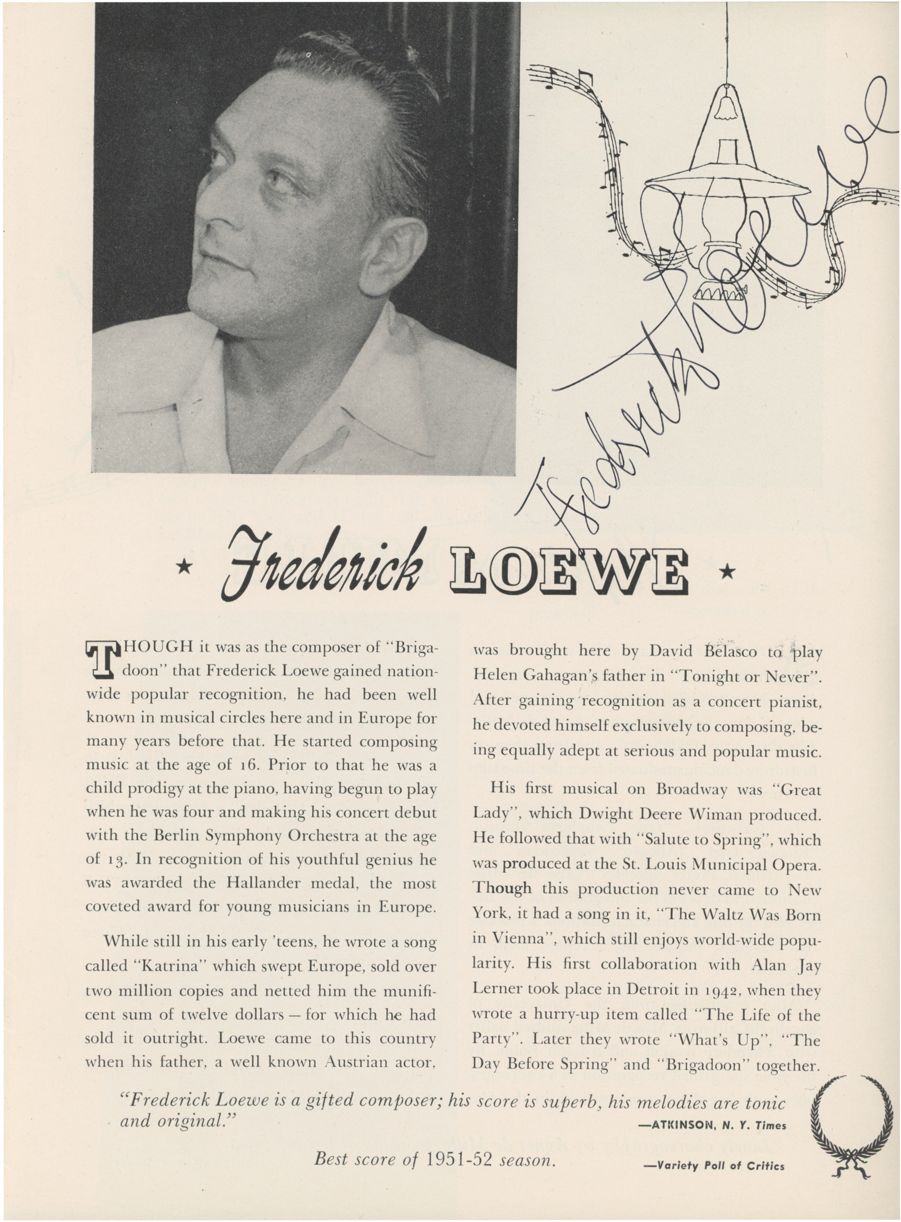Souvenir program for the original Broadway production of the classic musical Paint Your Wagon, signed by the composer and lyricist, the choreographer, and company members Ann Crowley, who played Jennifer, and Ralph Bunker. 16 pp. Light wear to spine, overall in fine condition. 9 x 11.5 inches (22.9 x 29.2 cm.).