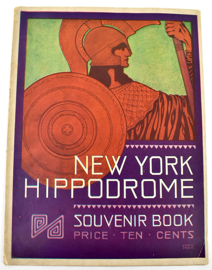 Souvenir book for the New York Hippodrome's 1914-15 season, featuring a striking red and purple illustration of Athena to cover and announcing the "Newest and Most Startling Production Ever Given on This Stage!," Wars of the World, giving the full show program, several printed musical excerpts from the show by Manuel Klein, detailed descriptive essays regarding the production, halftone photographs of the venue and show scenes. 24 pp. Crease to lower right corner, light wear to wrappers, one page with tear to margin, overall in fine condition. 9 x 12 inches (22.9 x 30.5 cm.).