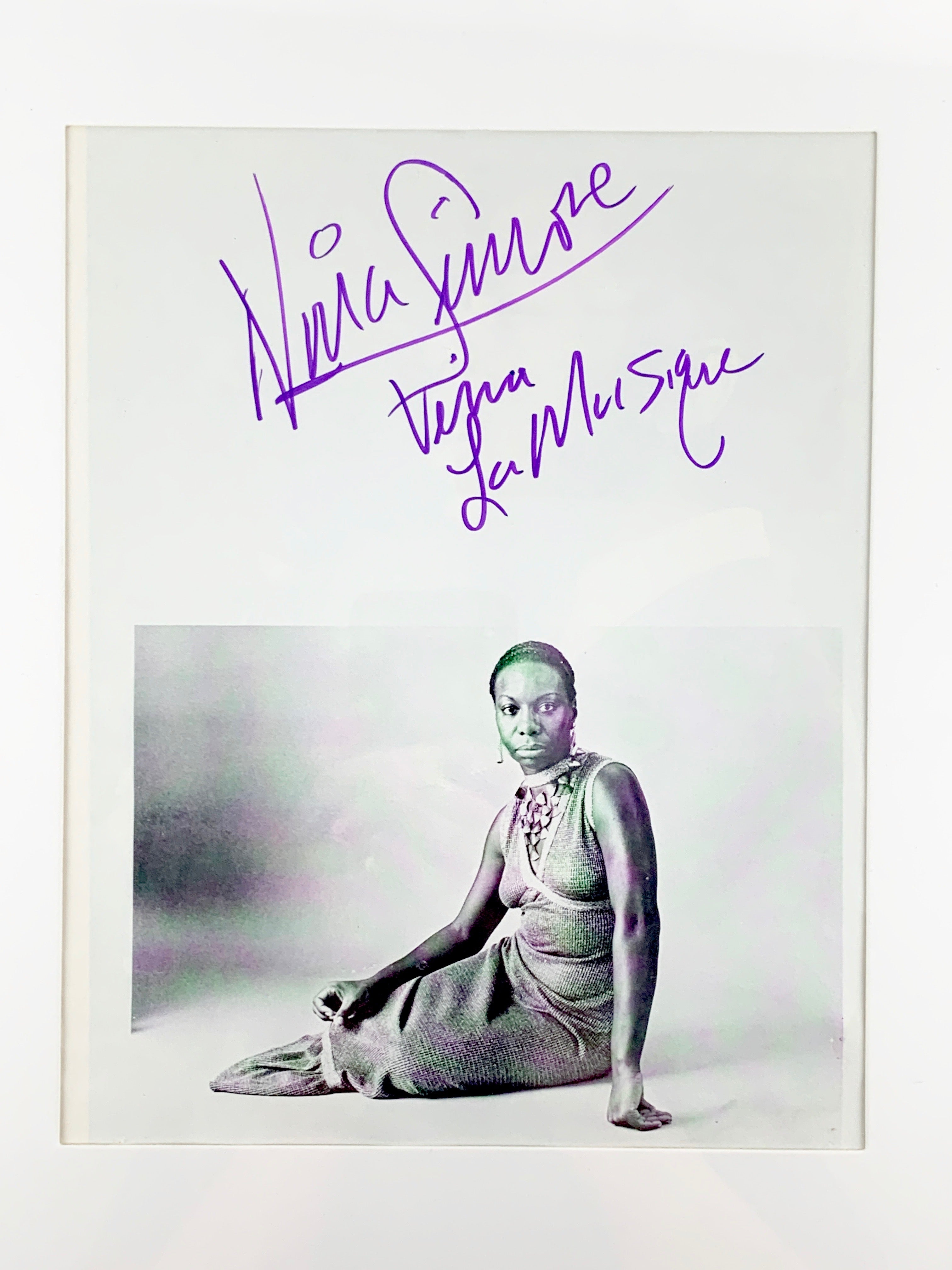 Signed halftone photograph of the legendary jazz singer and civil rights activist shown in seated pose, ca. 1987. She has signed and inscribed at the head in purple ink "Nina Simone / Viva La Musique." An identical inscription in same ink (also including an AMQS) may be seen at ninasimoneproject.org and is dated by them to 1987. Evidently removed from a concert program and measuring 8.25 x 11 inches (22 x 28 cm). Two mat remnants on verso from prior mounting, else fine. Signed photographs of Simone are notoriously uncommon.
