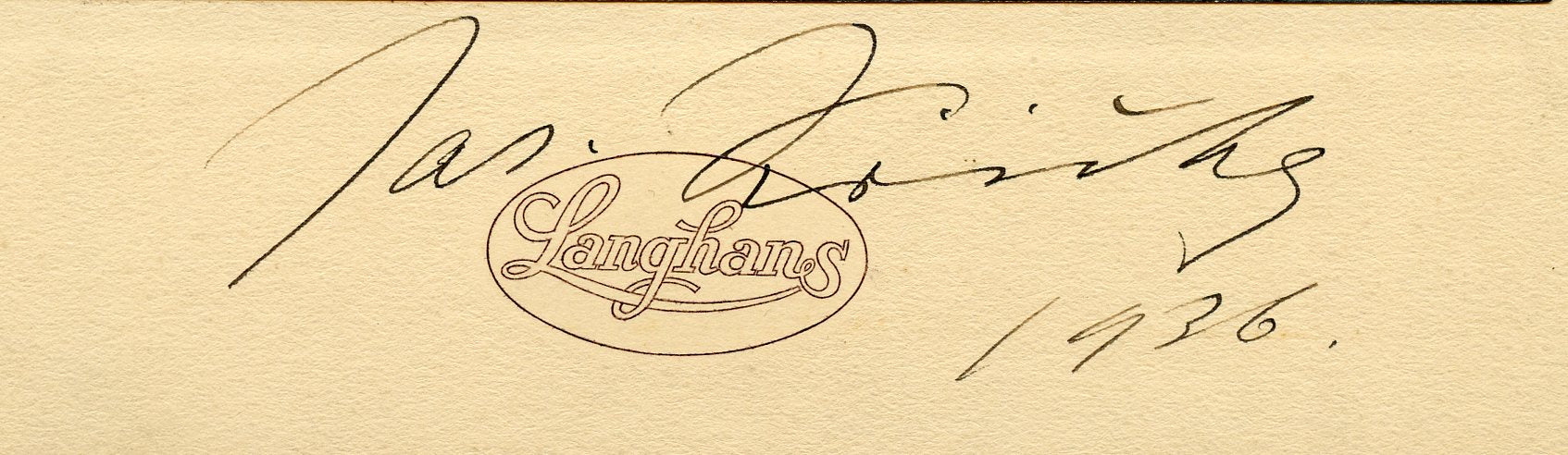 Kricka, Jaroslav. (1882-1969). Portrait Photograph Signed. Large half-length portrait photograph of the Czech composer and conductor in formal attire by Langhans in Prague, signed on the photographer's mount "Jar. Křička 1936" with printed Langhans logo to lower margin. Size of photograph 8.75 x 6.25 inches (22.5 x 16 cm); size of mount 13.5 x 10.5 inches (34 x 26.5 cm). Mount browned and somewhat worn; small tear to right edge, else fine.