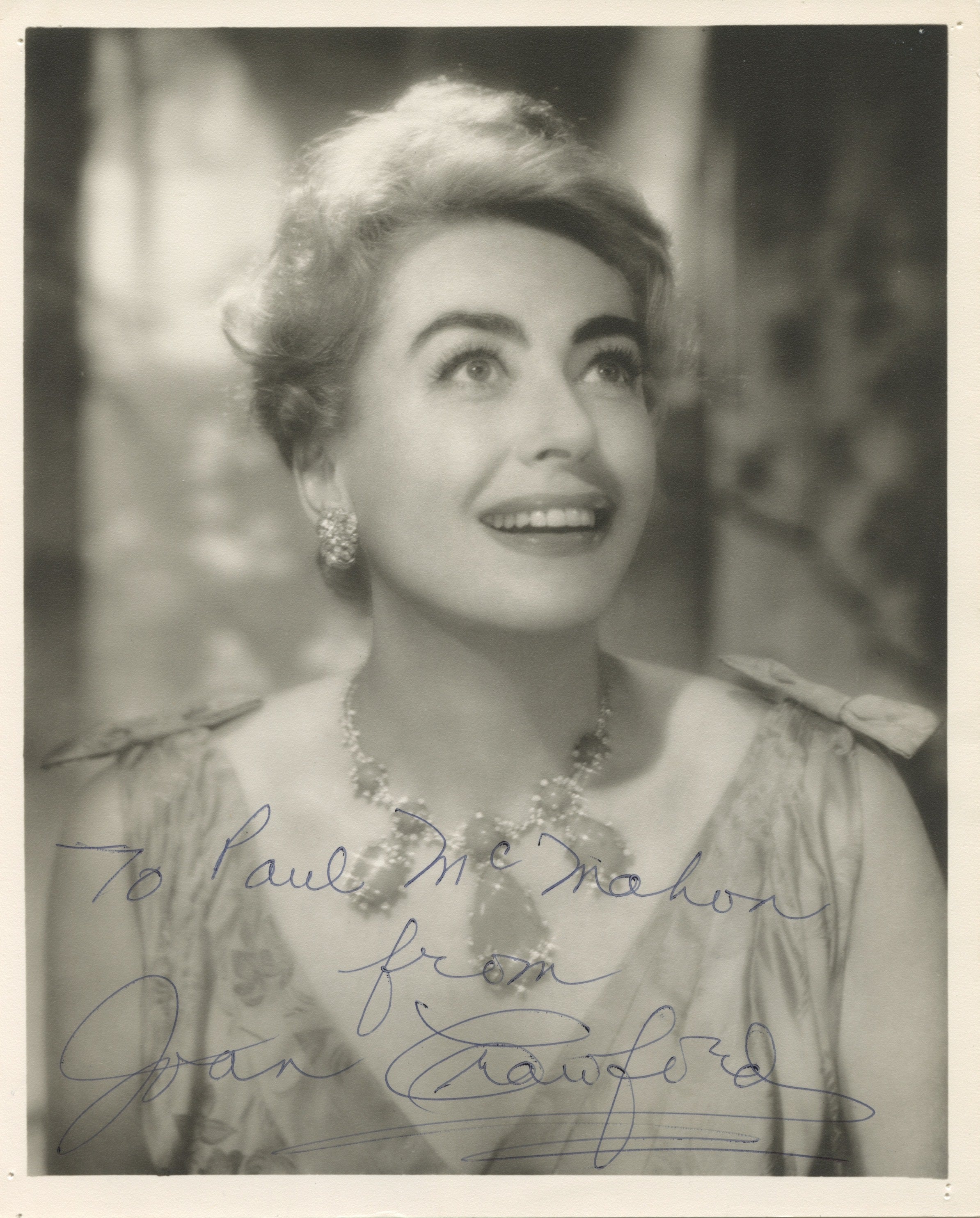 Original doubleweight John Engstead photograph of the noted Hollywood actress, signed and inscribed "To Paul McMahon/ from / Joan Crawford." Small pinholes to corners, else in fine condition. No photographer stamp but an image known to have been taken by Engstead in 1961. 8 x 10 inches; 20.5 x 25.5 cm.