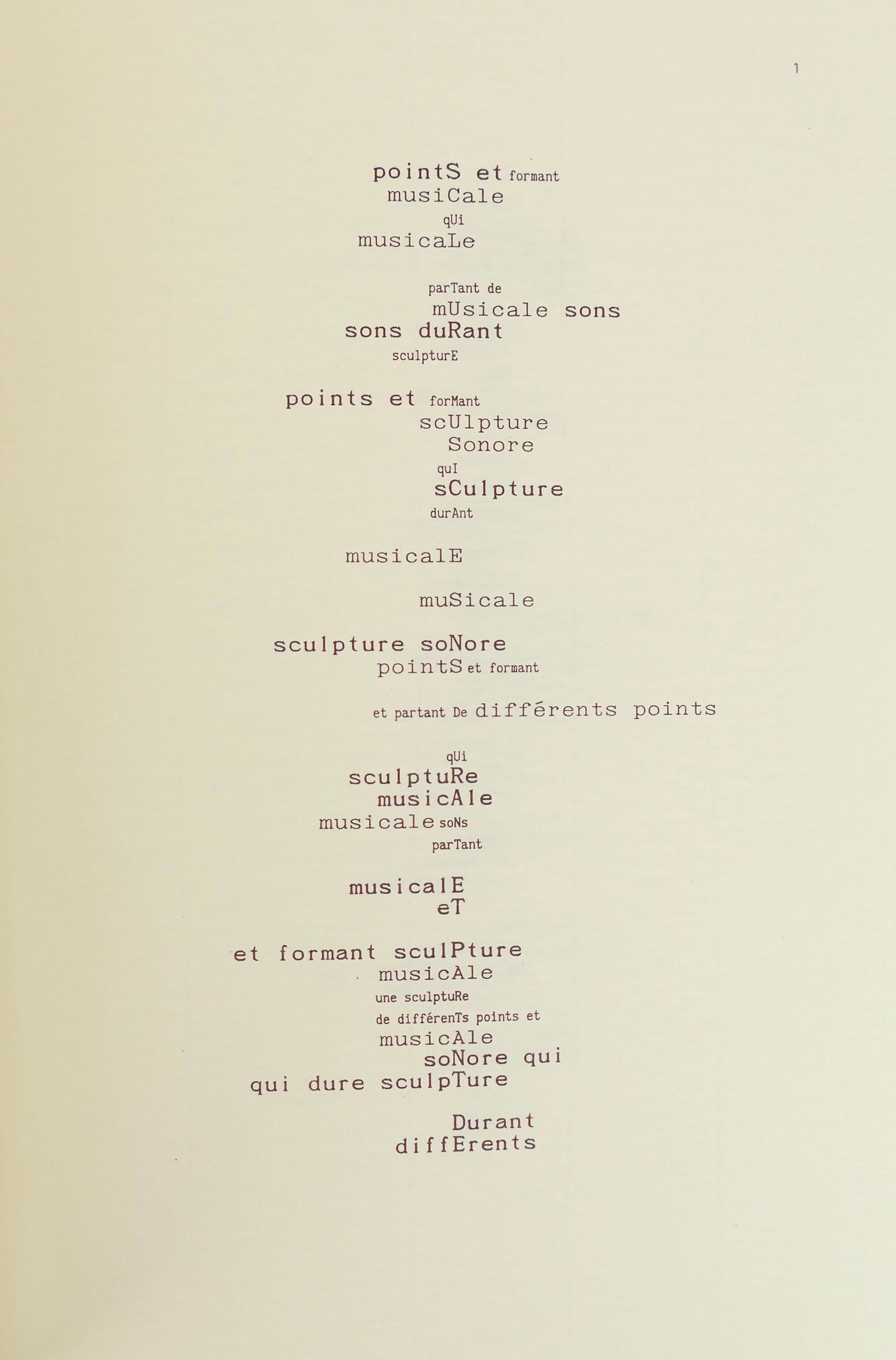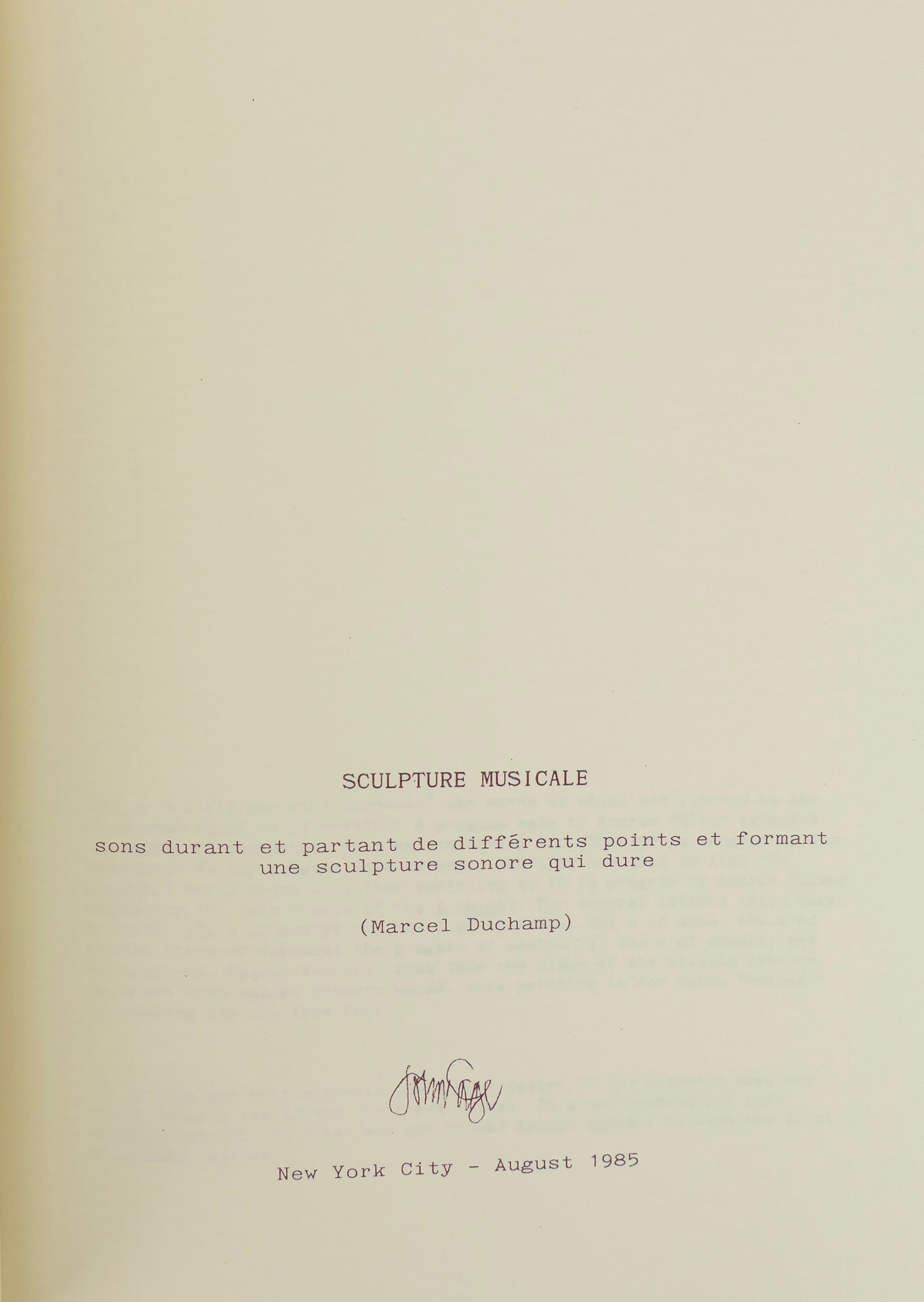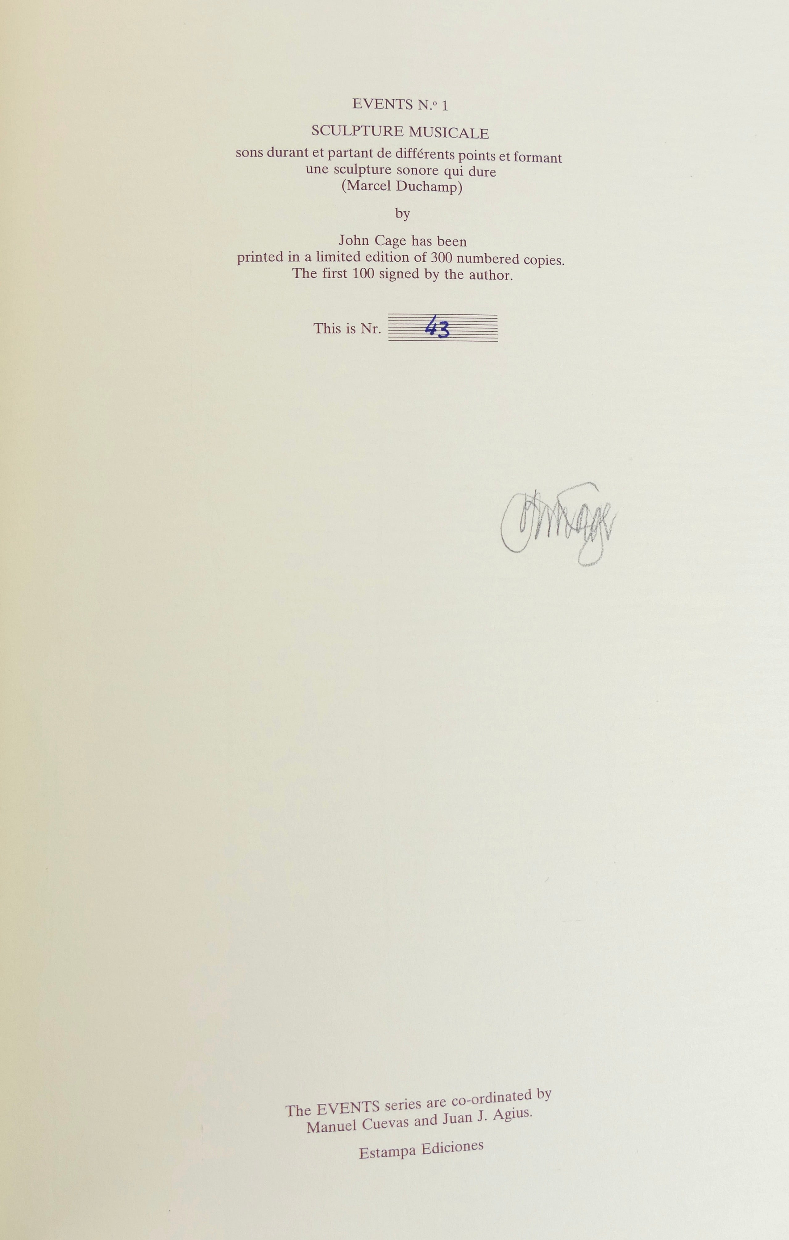 Sculpture musicale. Sons durant et partant de différents points et formant une sculpture sonore qui dure (Marcel Duchamp). Softcover. 4to. 18 pp. Numbered 43 of 300 copies, the first 100 being signed at the rear on the limitation page. Covers fine, minor yellowing, protected by a glassine cover.