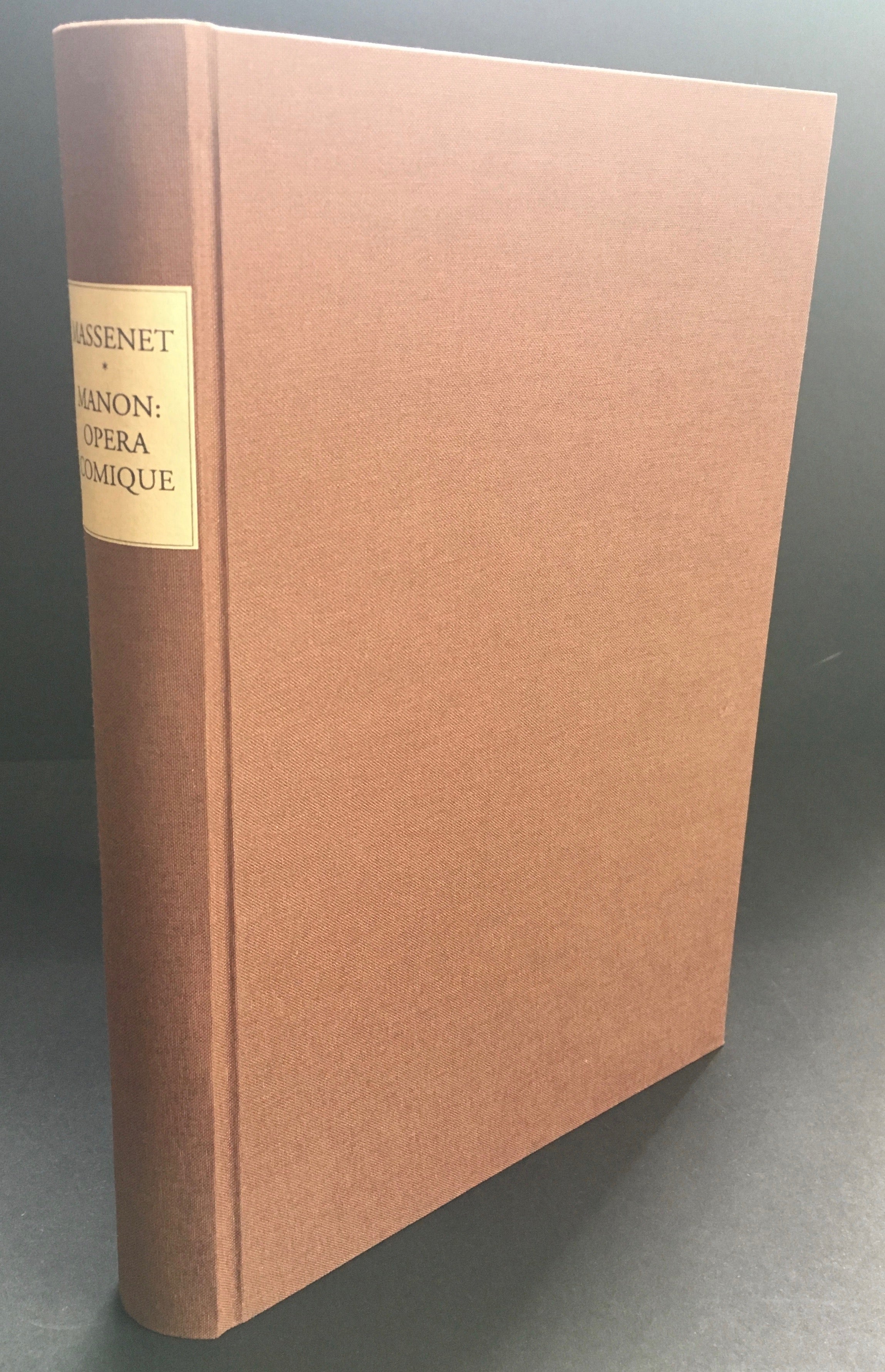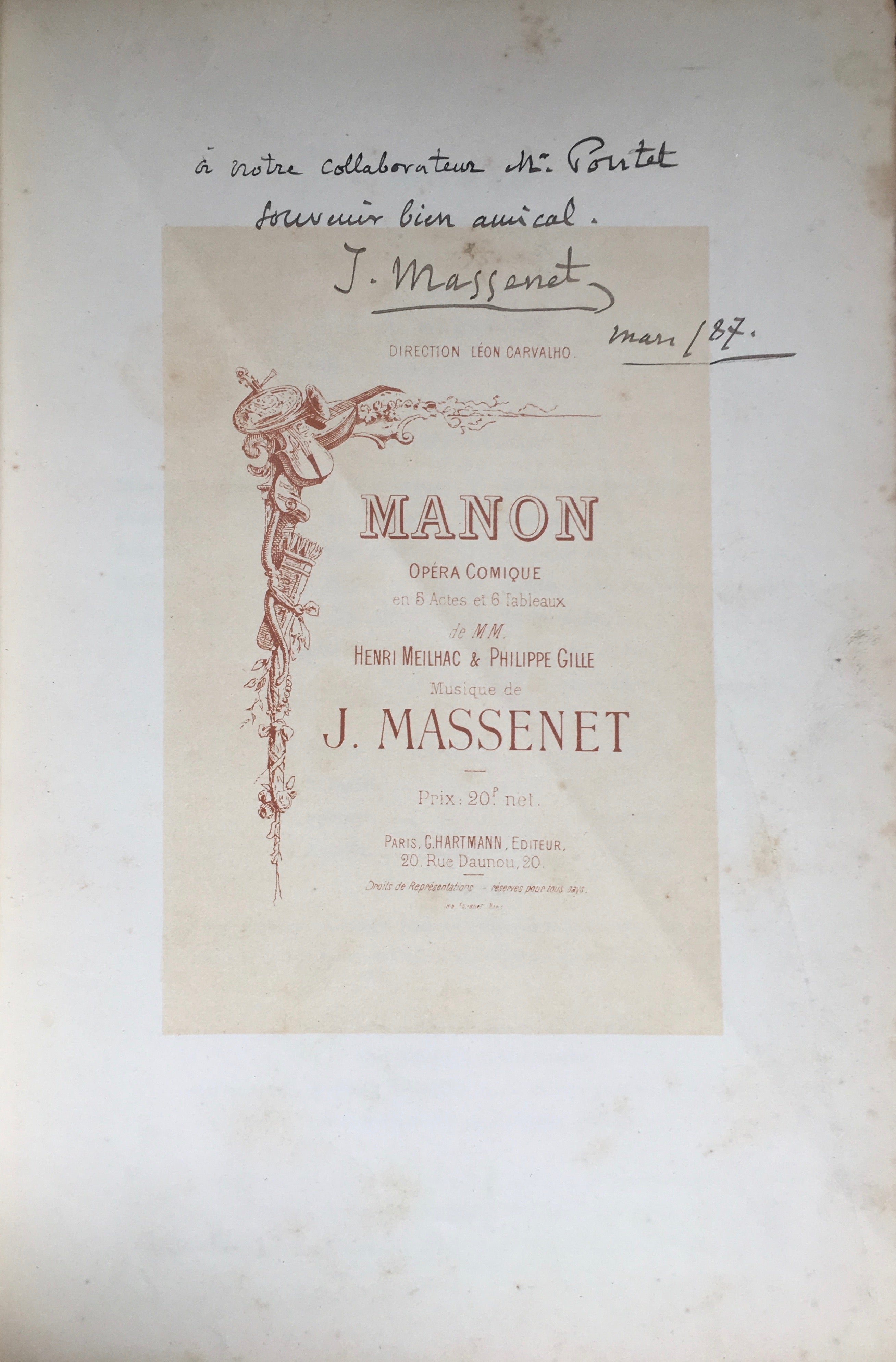 Massenet, Jules. (1842-1912). "Manon" - Signed and Inscribed to the Director of the Théatre-Royal at Anvers. Paris: G. Hartmann. [1884]. Opéra comique en 5 Actes et 6 Tableux. Piano-vocal score. 391 pp. Lithographed. [PN] G.H.1356-86. A fine copy, boldly inscribed on the title page to the director of the Théatre-Royal at Anvers: "à notre collaborateur M. Pontet / souvenir bien amical / J. Massenet. Mars / 87." First page of music with repaired tear, lacking wrappers, else fine. Score nicely bound in modern full brown cloth.