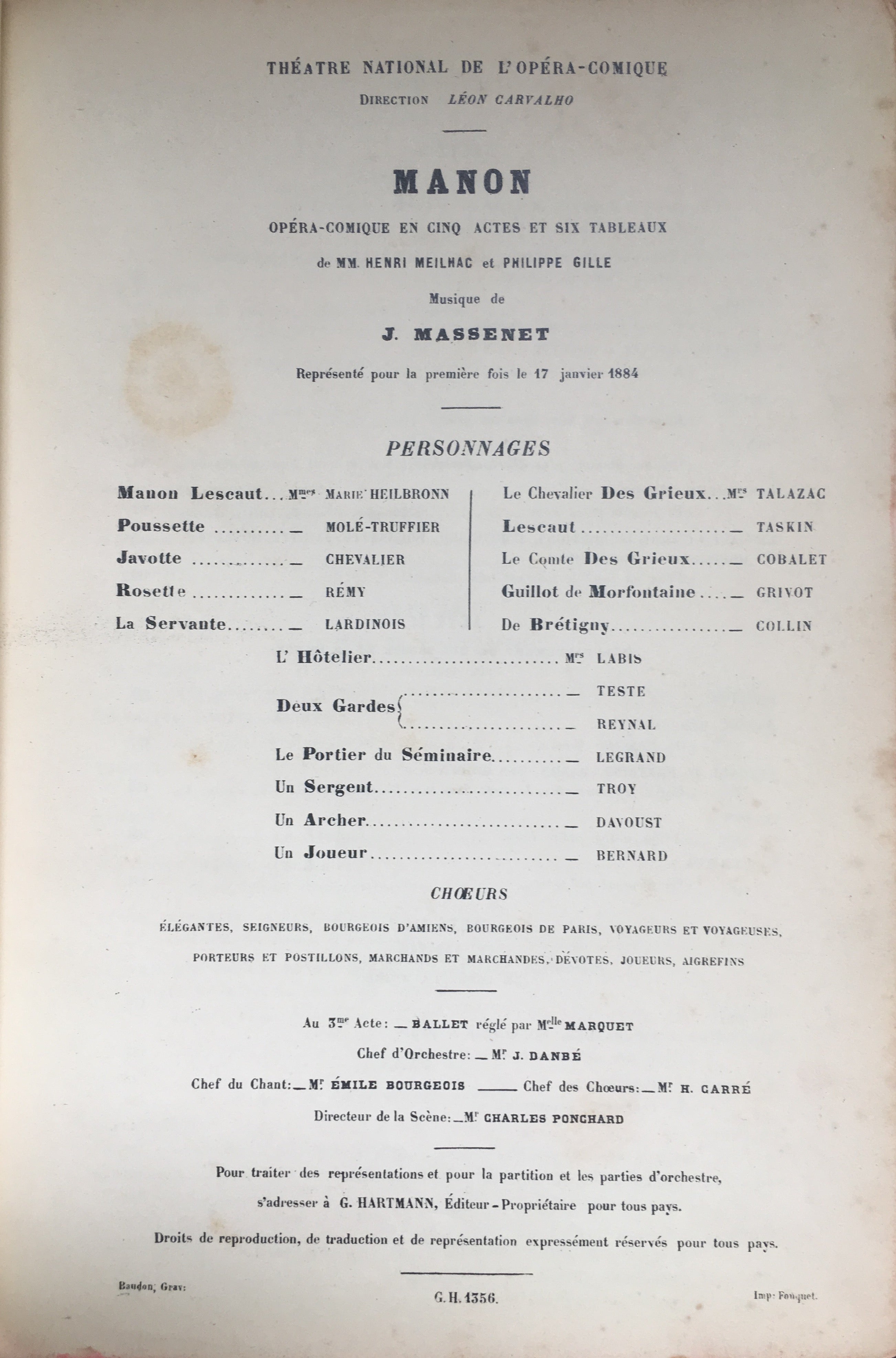 The opera was first performed at the Opéra-Comique in Paris on January 19, 1884 with enormous success and has remained Massenet's most popular and enduring opera.