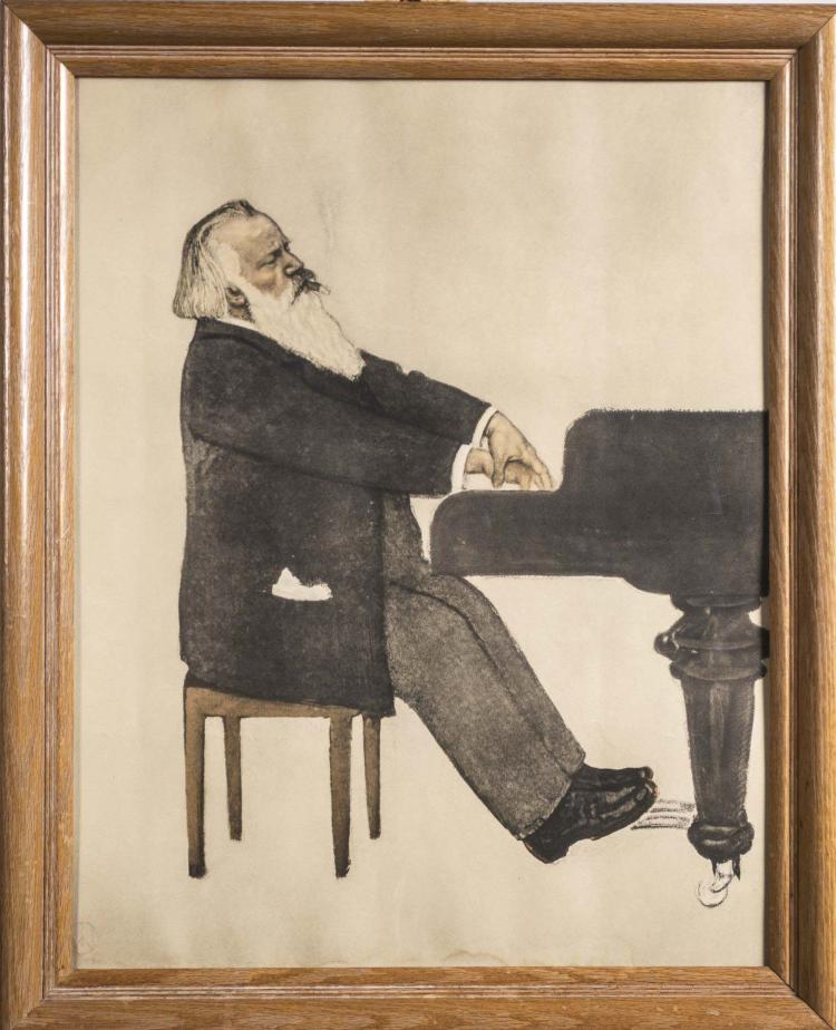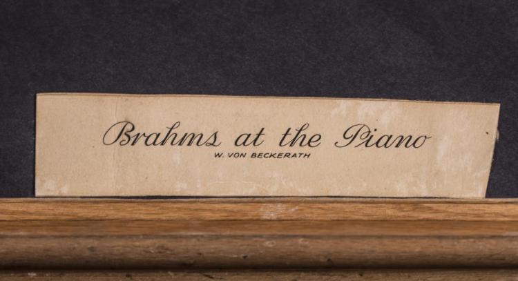Brahms, Johannes. (1833–1897) [Beckerath, Willy von. (1868–1938)]. "Johannes Brahms at the Piano" - Signed Framed Print. Lithograph print, 20th century, of Willy von Beckerath's well-known color portrait. Signed by Beckerath with a monogram at the lower left corner. Brahms is shown playing the piano with one hand crossing over the other, while smoking one of his signature cigars. Sight size 18 x 23 inches. Framed.